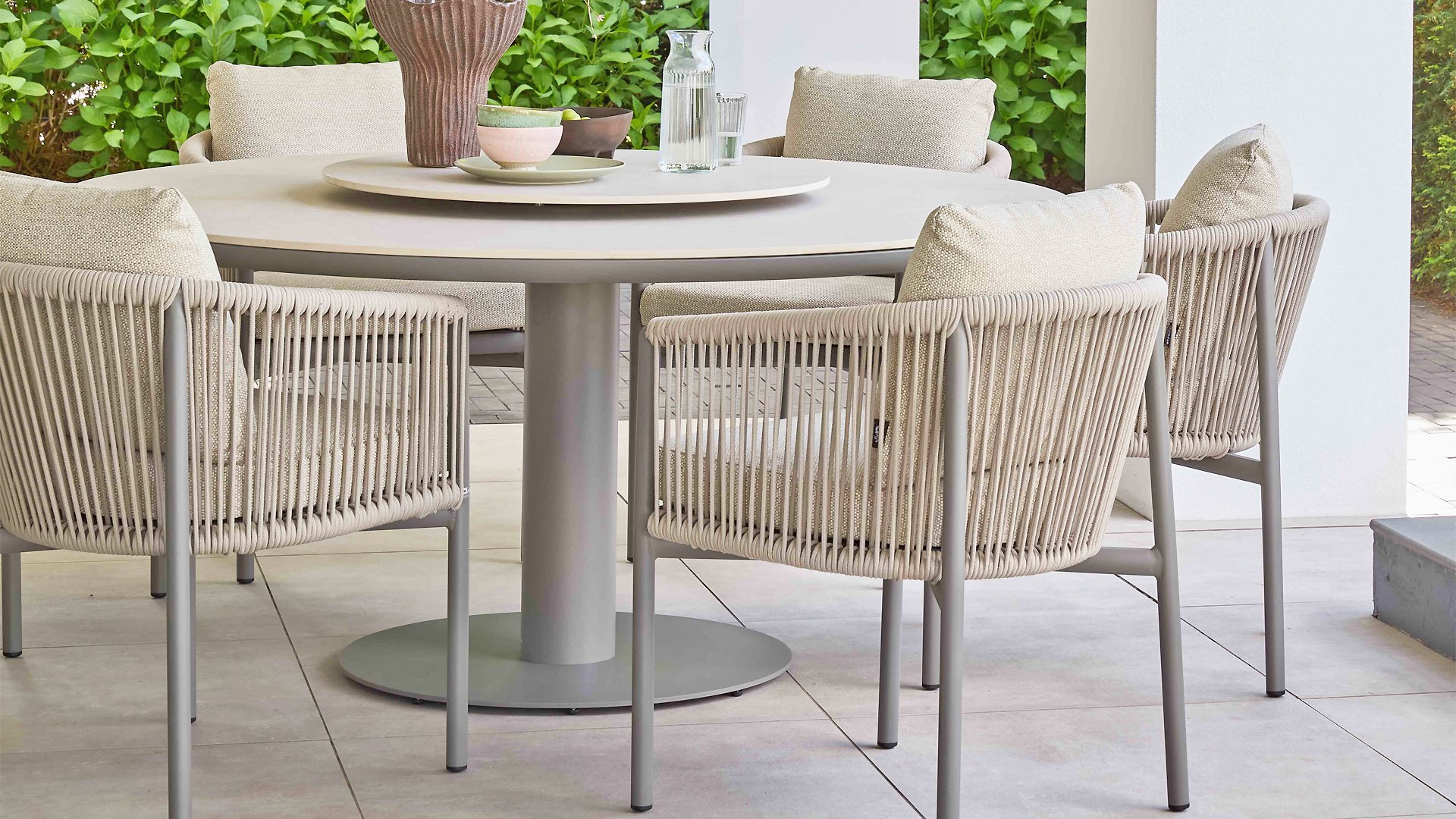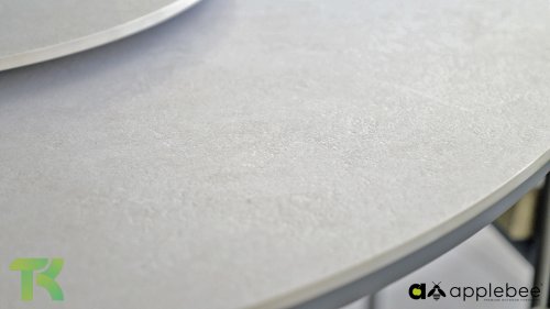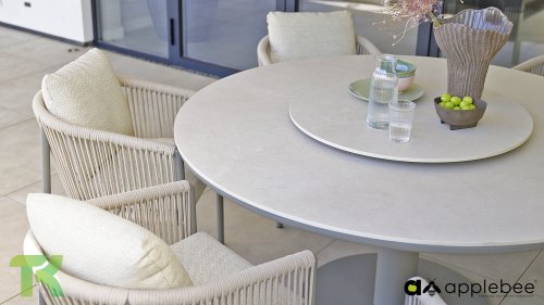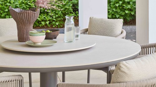 De Melville is een bijpassende ronde diningtafel, dit is het kloppende hart van de set. Dankzij de centrale poot geniet iedereen van maximale beenruimte. Het tafelblad, uitgevoerd in hoogwaardig sintered stone met een light grey keramiek look, is niet alleen kras- en weerbestendig, maar ook voorzien van een geïntegreerd draaiplateau (Lazy Susan). Hierdoor zijn alle hapjes en drankjes voor elke gast binnen handbereik.