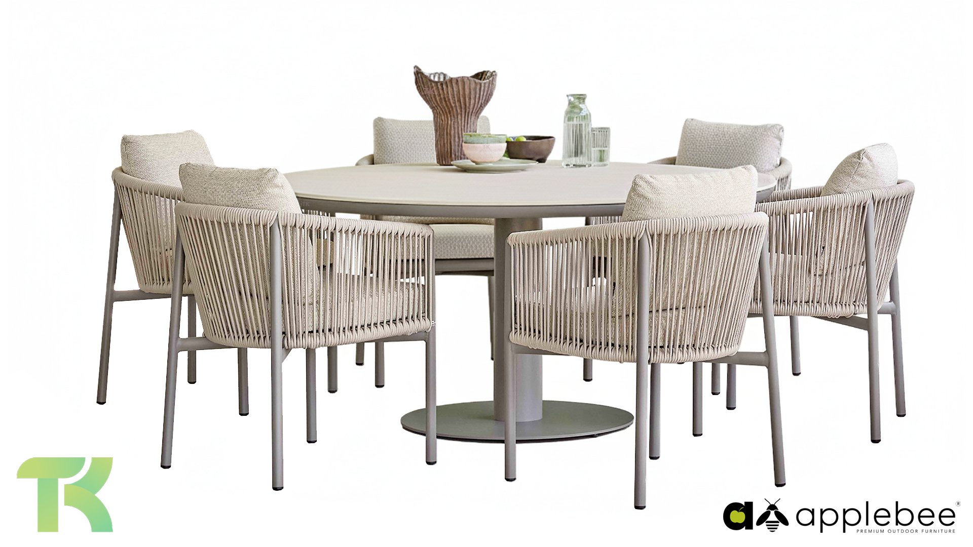 De Apple Bee Bora Bora Dining is ideale setting voor wie buiten net zo stijlvol wil dineren als binnen. Het verfijnde aluminium frame in de kleur warm taupe vormt een prachtig contrast met het dubbelgevlochten rope in de natuurlijke kleur Oak. Dit vlechtwerk geeft de stoelen een luchtig en transparant karakter, terwijl de licht gebogen rugleuning en de royaal gevulde kussens zorgen voor een actieve, maar uiterst comfortabele zit.