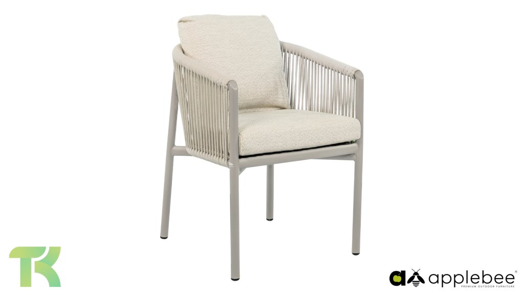 De Apple Bee Bora Bora Dining is ideale setting voor wie buiten net zo stijlvol wil dineren als binnen. Het verfijnde aluminium frame in de kleur warm taupe vormt een prachtig contrast met het dubbelgevlochten rope in de natuurlijke kleur Oak. Dit vlechtwerk geeft de stoelen een luchtig en transparant karakter, terwijl de licht gebogen rugleuning en de royaal gevulde kussens zorgen voor een actieve, maar uiterst comfortabele zit.