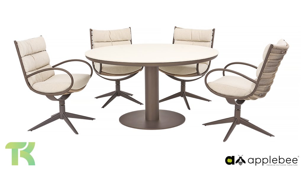 De Apple Bee Camp Bay Bronze, fris, elegant, comfortabel. Deze dining set combineert een krachtig, donker kleurenpalet met slimme functionaliteit, waardoor je geniet van ongekend comfort tijdens lange zomeravonden. De organische vormen en tinten maken deze set tot een rustpunt in de tuin, terwijl de robuuste materialen zorgen dat je er jarenlang plezier van hebt.