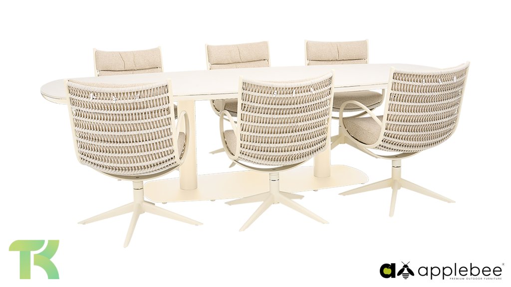 De Apple Bee Camp Bay Oyster, fris, elegant, comfortabel. Deze dining set combineert een verfijnd, licht kleurenpalet met slimme functionaliteit, waardoor je geniet van ongekend comfort tijdens lange zomeravonden. De organische vormen en zachte tinten maken deze set tot een rustpunt in de tuin, terwijl de robuuste materialen zorgen dat je er jarenlang plezier van hebt.