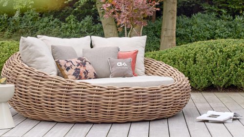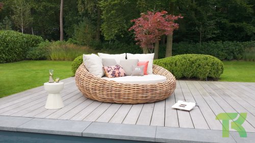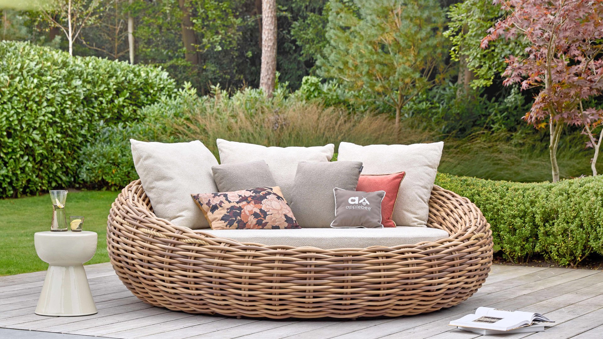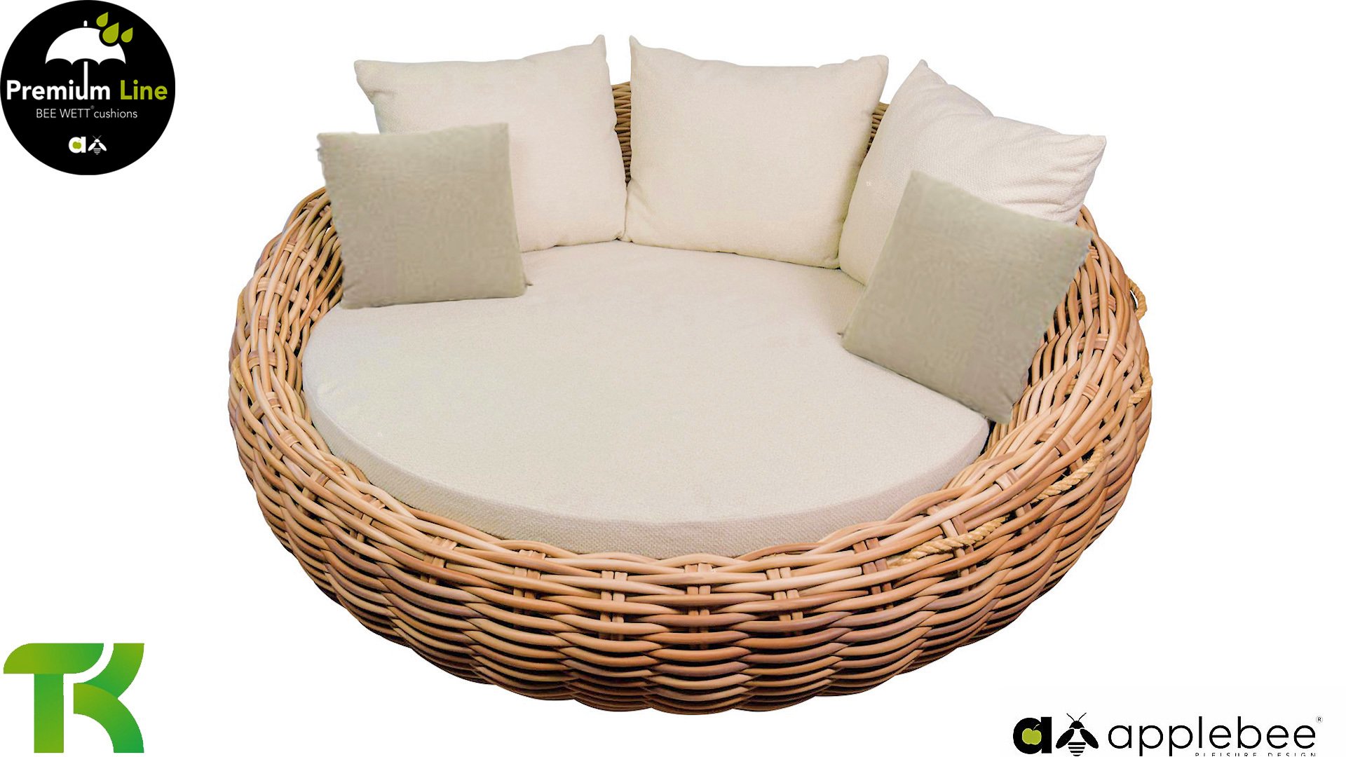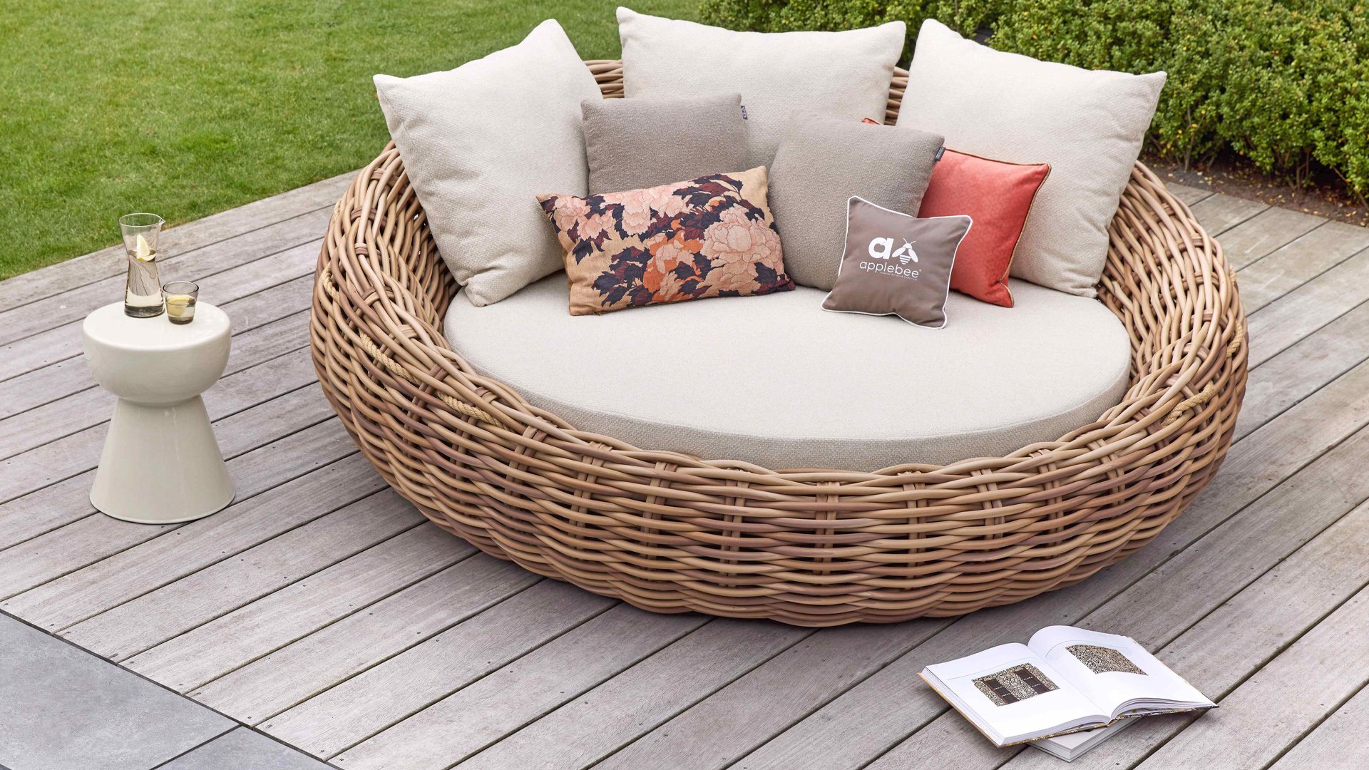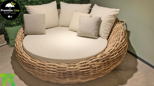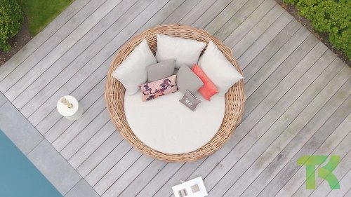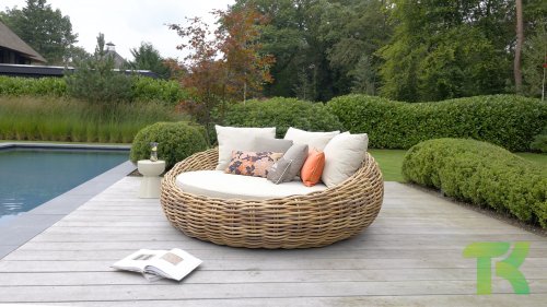 Apple Bee Cocoon Daybed; “Bigger is better”. Het Cocoon Daybed heeft een indrukwekkende diameter van maar liefst 220 cm en ligt vol met fraaie loungekussens. Vanzelfsprekend biedt het gigantisch formaat, ruimschoots plaats aan twee personen. Ondanks het formaat blijft het Daybed verrassend makkelijk verplaatsbaar dankzij het mee gevlochten sissal touw.
