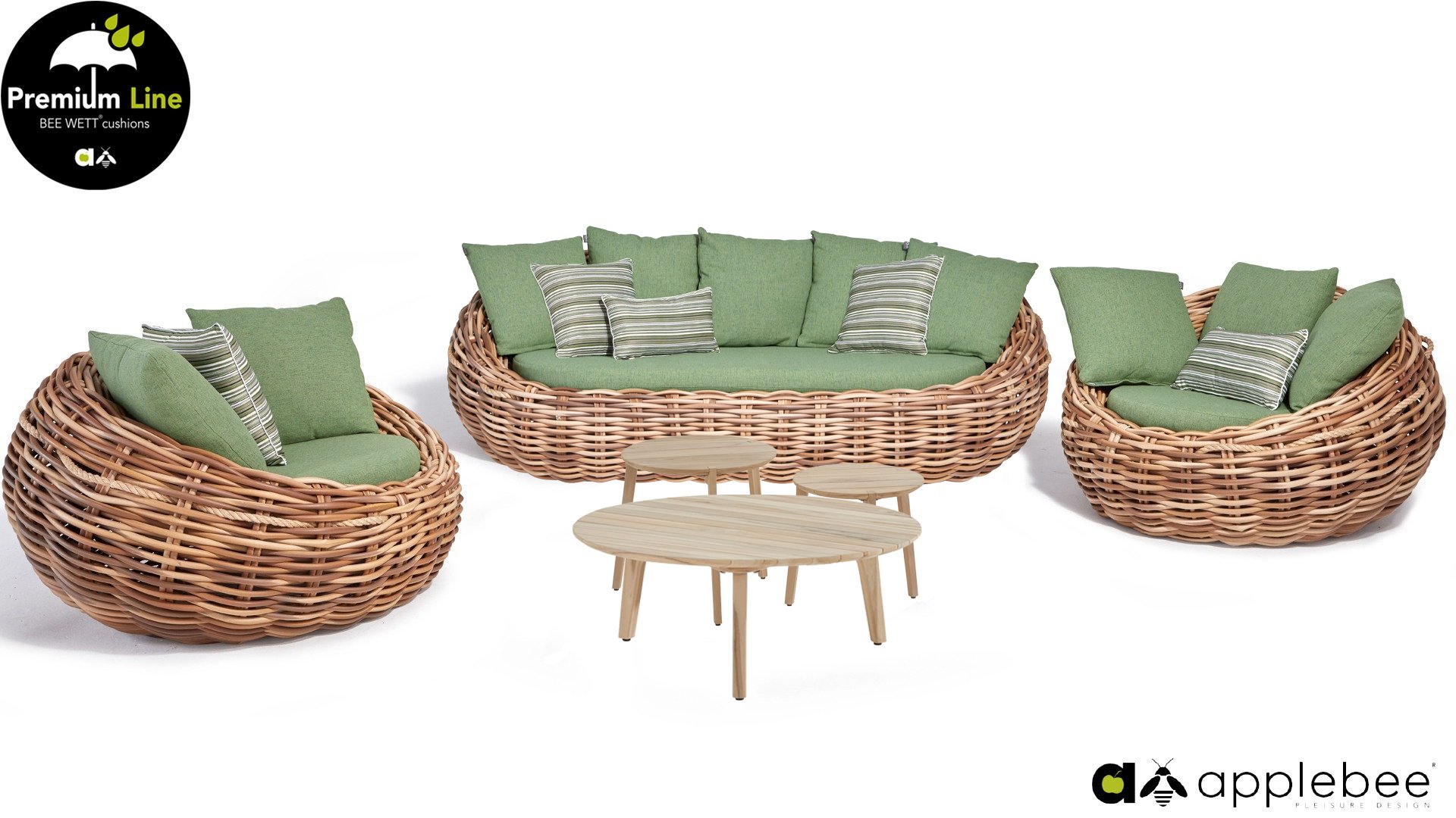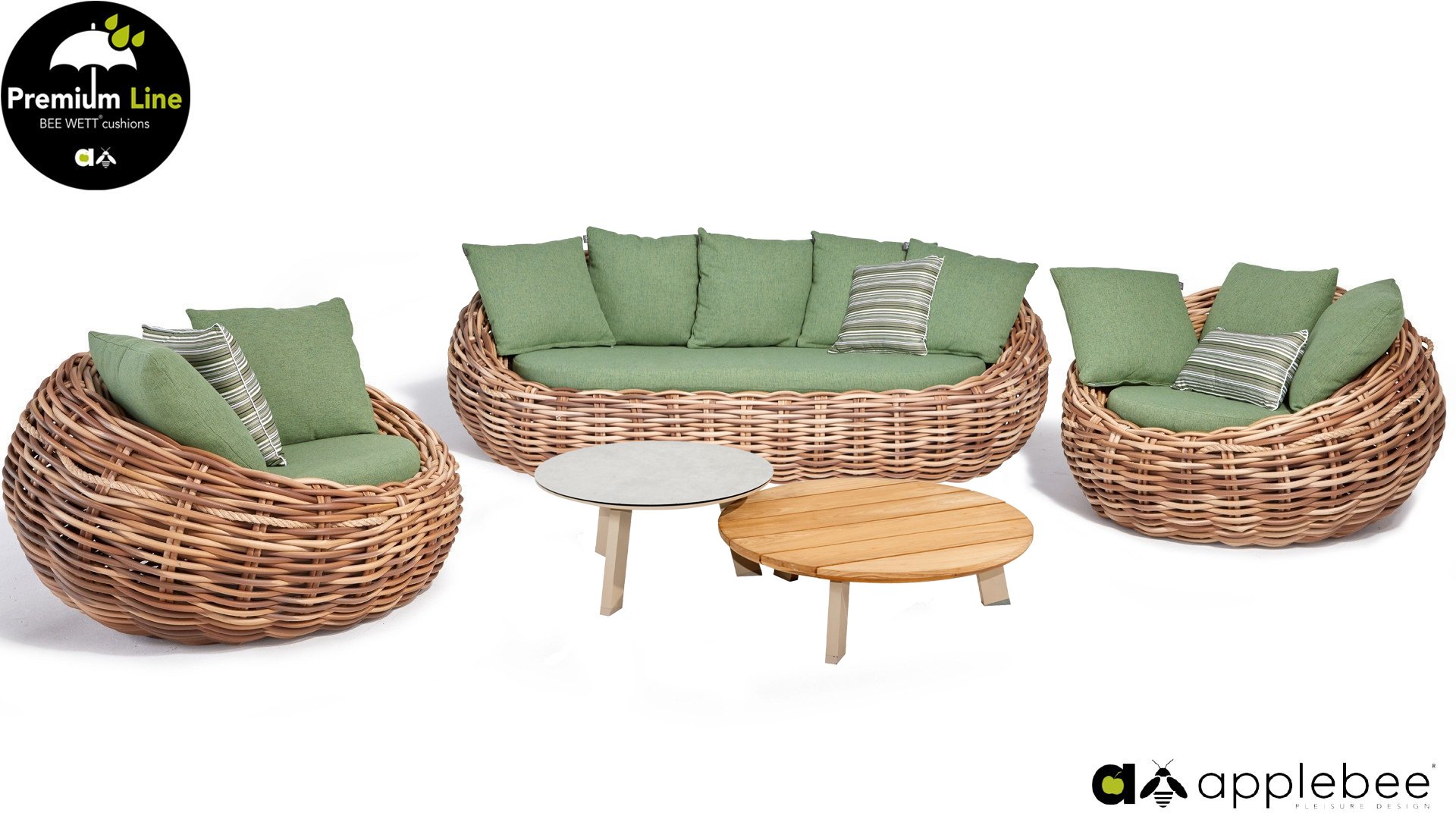 Terug van weggeweest! Niet voor niets is de Apple Bee Cocoon Loungeset opnieuw opgenomen in de collectie van Apple Bee en ditmaal in een geheel eigentijds jasje. Nog steeds geïnspireerd op de veilige, geborgen cocon, waarin een rups transformeert naar een prachtige vlinder. Fraaie groene loungekussens uiteraard met Bee Wett® technologie in combinatie met het uitzonderlijk dik gevlochten Biculair® vlechtdraad van maar liefst 20mm! Nog steeds in de typerende ronde vorm die Sako Wijma bij het eerste Cocoon-ontwerp zo prachtig wist te realiseren. Je eigen geborgen plekje in de tuin of op het terras.