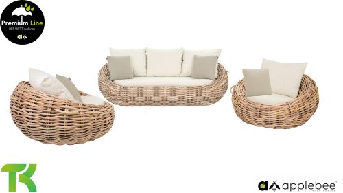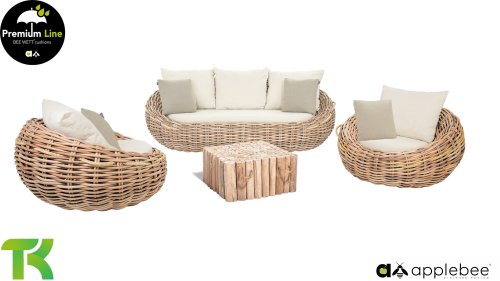Terug van weggeweest! Niet voor niets is de Apple Bee Cocoon Loungeset opnieuw opgenomen in de collectie van Apple Bee en ditmaal in een geheel eigentijds jasje. Nog steeds geïnspireerd op de veilige, geborgen cocon, waarin een rups transformeert naar een prachtige vlinder. Fraaie Cream kleurige loungekussens van de eigentijdse Bouclé stof, uiteraard met Bee Wett® technologie in combinatie met het uitzonderlijk dik gevlochten Biculair® vlechtdraad van maar liefst 20mm! Nog steeds in de typerende ronde vorm die Sako Wijma bij het eerste Cocoon-ontwerp zo prachtig wist te realiseren. Je eigen geborgen plekje in de tuin of op het terras.