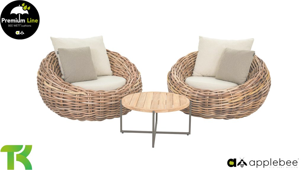 Kenmerkend voor Apple Bee is het gebruik van speciaal Biculair® vlechtwerk, oorspronkelijk ontwikkeld voor professionele toepassingen in de horeca. Dit Biculair® vlechtwerk is een natuurgetrouw, duurzaam alternatief voor rotan. Deze zeer duurzame synthetische rotanvezel (HDPE) is volledig weerbestendig, kleurecht, recyclebaar en dus een milieuvriendelijke keuze. Het uiterlijk en de prestaties van het meubilair blijven dus onaangetast door de Europese weersomstandigheden en de kleuren behouden hun natuurlijke levendigheid. De superieure kwaliteit van dit vlechtwerk, gecontroleerd door de Nederlandse Organisatie voor Toegepast Natuurwetenschappelijk Onderzoek (TNO), is duidelijk in vergelijking met andere vergelijkbare materialen.