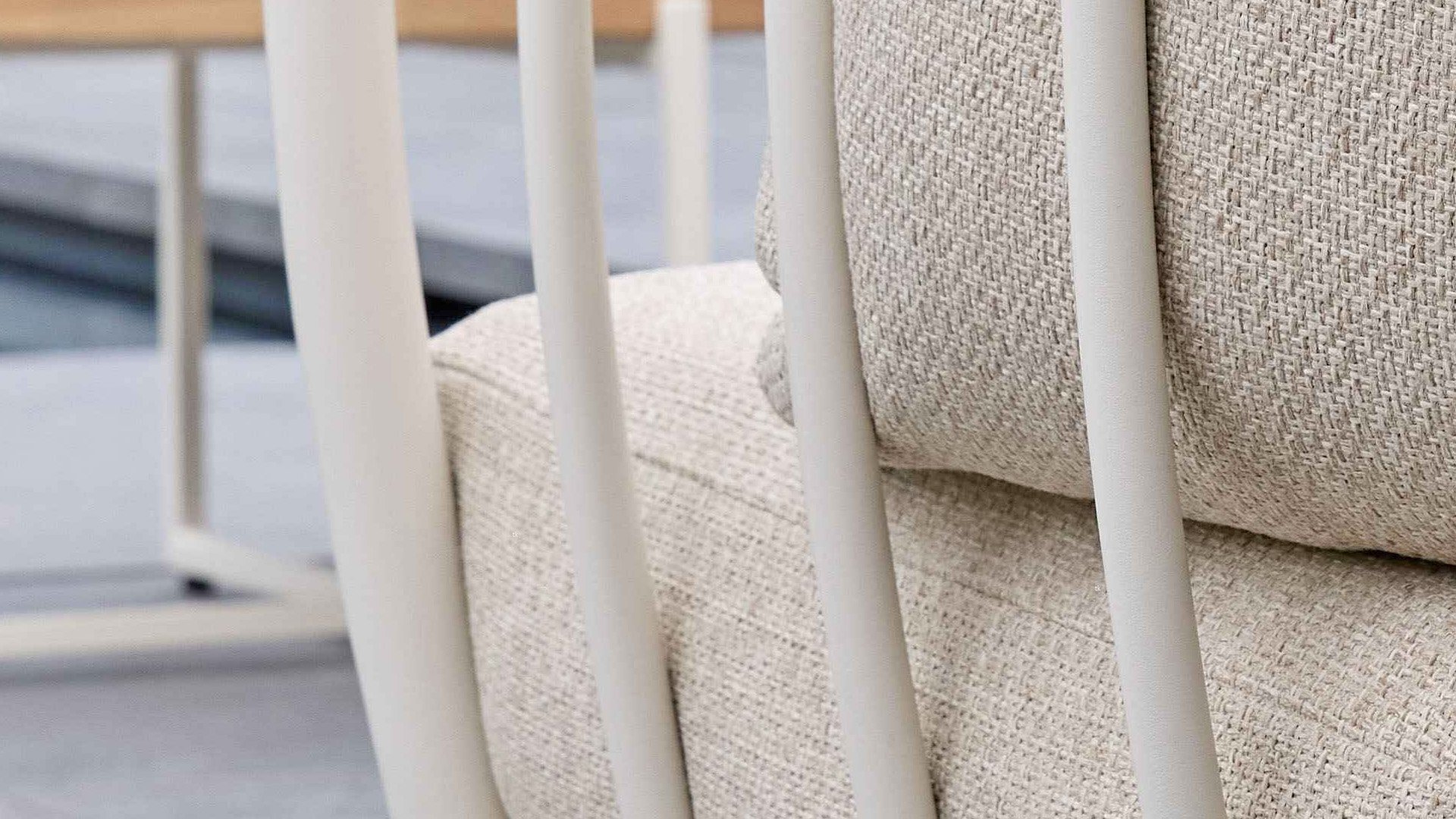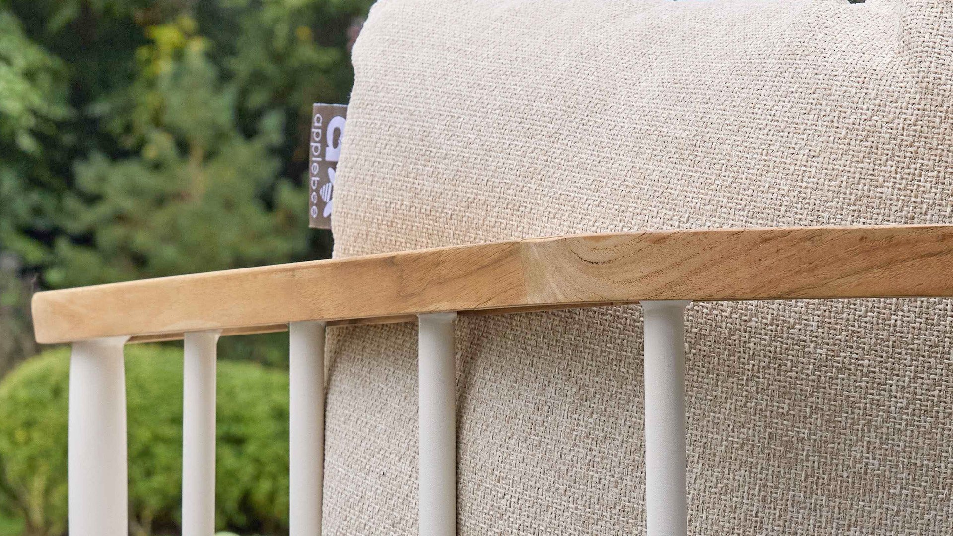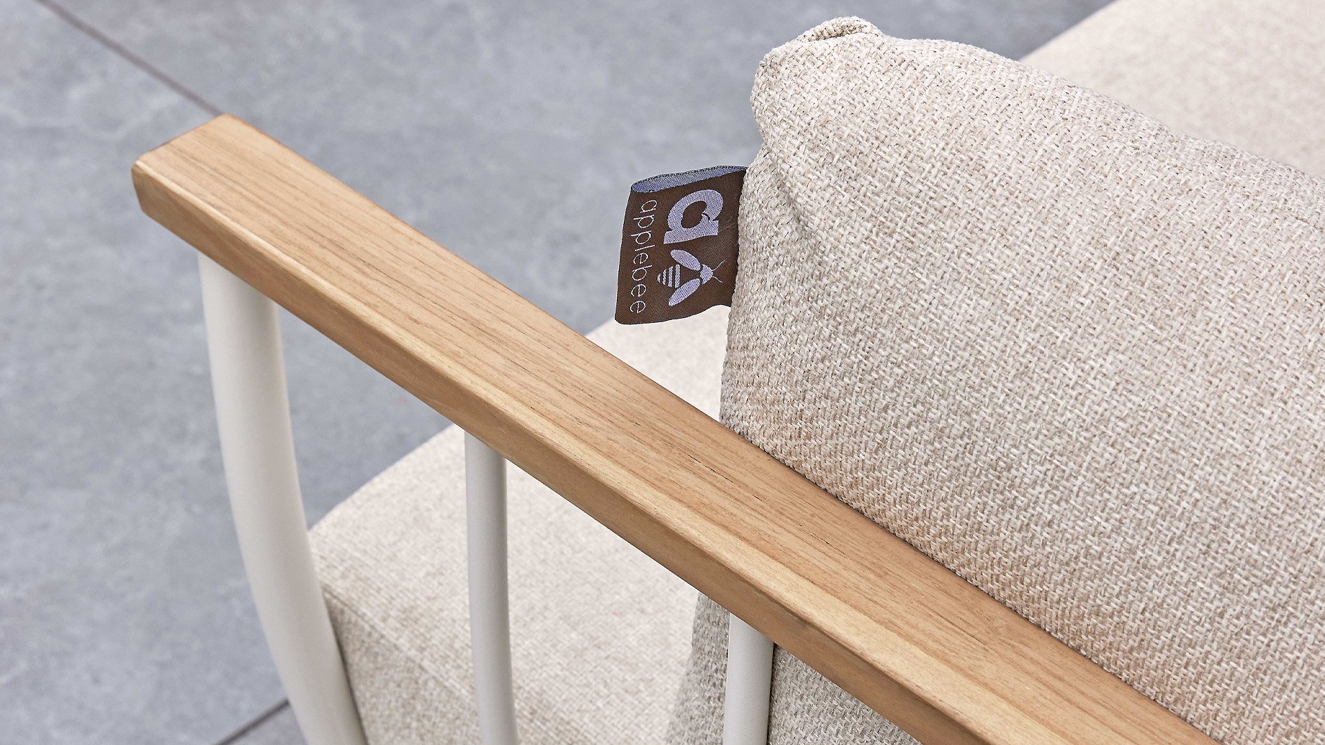 De Apple Bee Condor Lounge Oyster heeft een strakke, stoere look. Het basismateriaal is Oyster gekleurd gepoedercoat aluminium. De BEE WETT® kussens hebben een grove weefstructuur, maar met een soft touch. De mooie rondingen in de rug en het gebruik van naturel teakhout in de leuningen geven de Condor een aangenaam vleugje natuurlijke warmte mee.