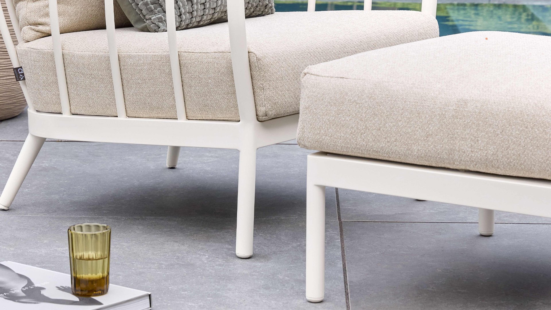 De Apple Bee Condor Lounge Oyster heeft een strakke, stoere look. Het basismateriaal is Oyster gekleurd gepoedercoat aluminium. De BEE WETT® kussens hebben een grove weefstructuur, maar met een soft touch.