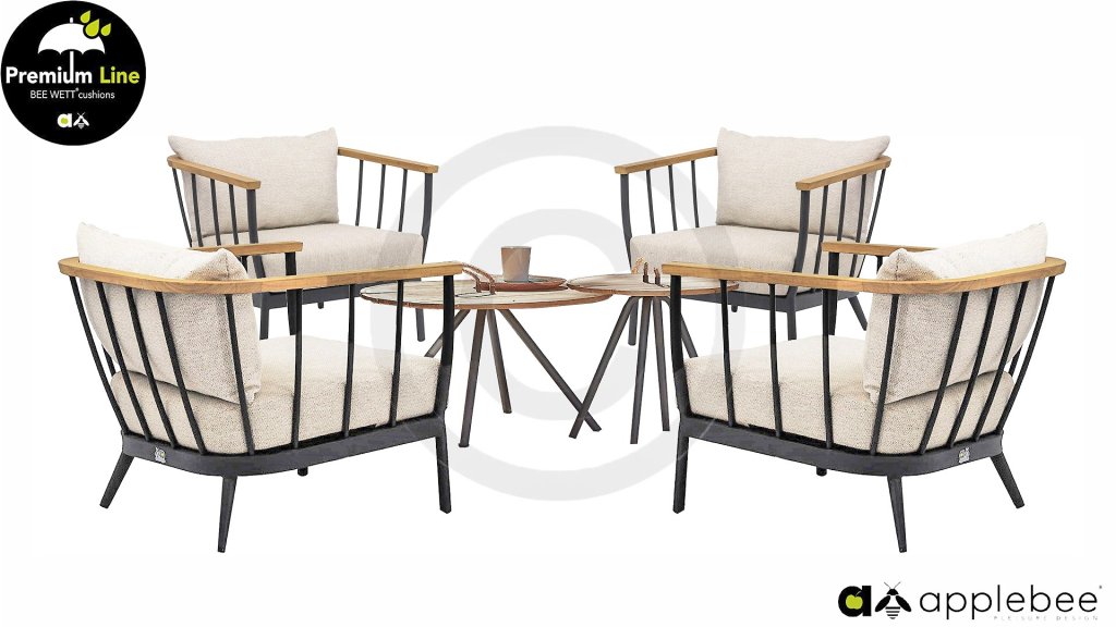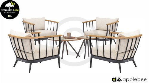 De Apple Bee Condor Lounge Black heeft een strakke, stoere look. Het basismateriaal is matzwart gepoedercoat aluminium. De BEE WETT® kussens hebben een grove weefstructuur, maar met een soft touch. De mooie rondingen in de rug en het gebruik van naturel teakhout in de leuningen geven de Condor een aangenaam vleugje natuurlijke warmte mee.