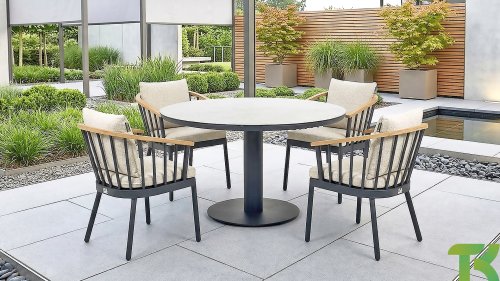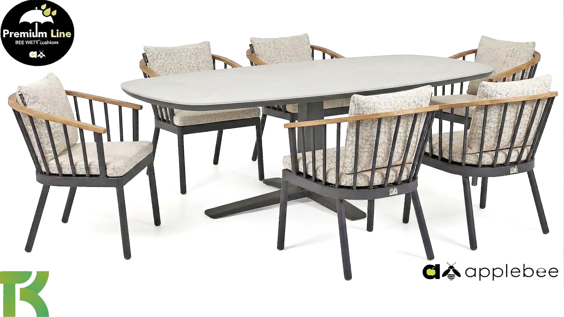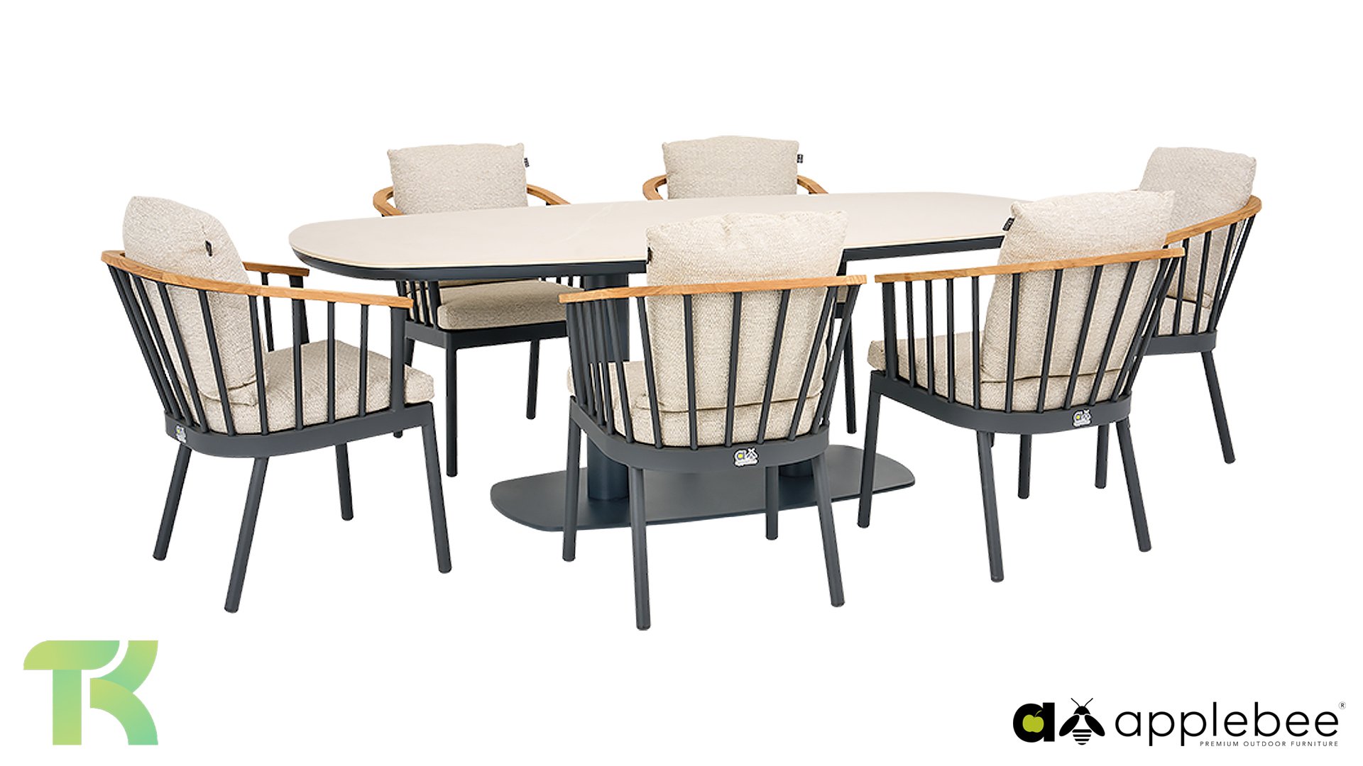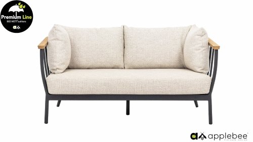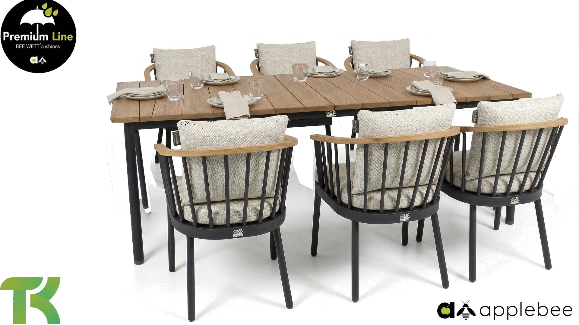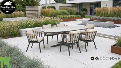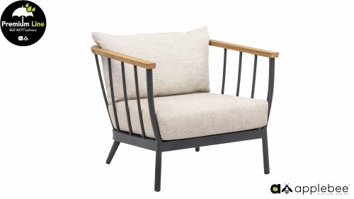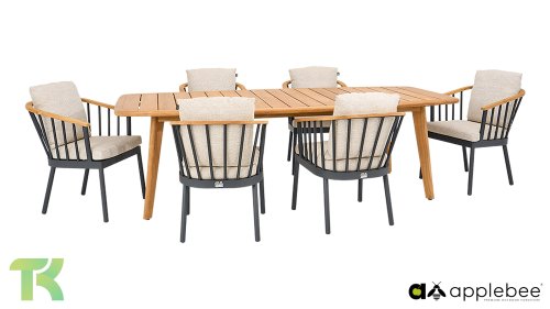 De Apple Bee Condor dining heeft een strakke, stoere look. Dit is doorgevoerd in zowel de stoel, als in het tafelonderstel. Het basismateriaal van de set is matzwart gepoedercoat aluminium, wat is toegepast in robuuste afmetingen. De BEE WETT® kussens hebben een grove weefstructuur, maar dit wel met een soft touch voor het optimale comfort. Samen met de mooie rondingen in de rug van de stoel en het gebruik van naturel teakhout in het tafelblad en de stoelleuningen, krijgt de Apple Bee Condor toch dat aangename vleugje natuurlijke warmte mee.