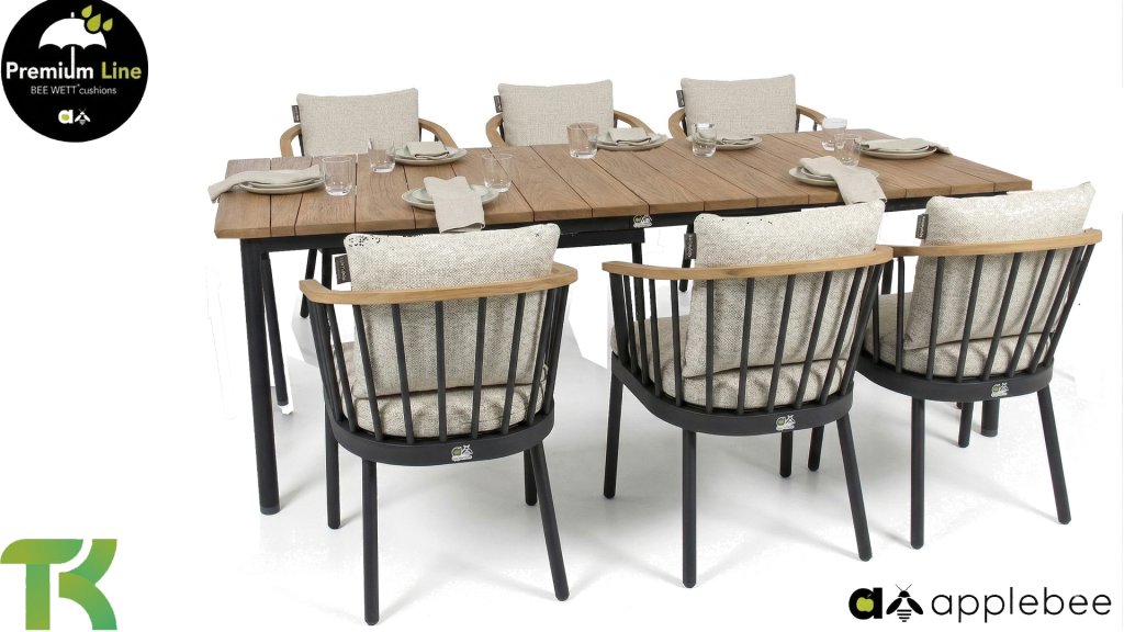 De Apple Bee Condor dining Black heeft een strakke, stoere look. Dit is doorgevoerd in zowel de stoel, als in het tafelonderstel. Het basismateriaal van de set is matzwart gepoedercoat aluminium, wat is toegepast in robuuste afmetingen. De BEE WETT® kussens hebben een grove weefstructuur, maar dit wel met een soft touch voor het optimale comfort. Samen met de mooie rondingen in de rug van de stoel en het gebruik van naturel teakhout in het tafelblad en de stoelleuningen, krijgt de Condor toch dat aangename vleugje natuurlijke warmte mee.
