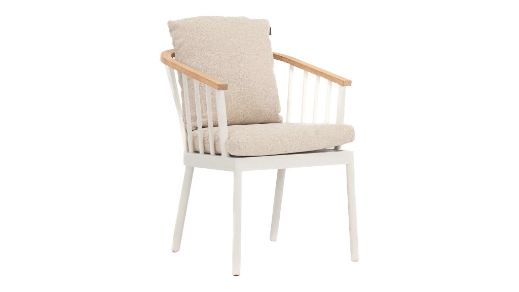 De Apple Bee Condor Dining Oyster is een stijlvolle en comfortabele keuze voor in de tuin. Deze tuinstoel valt op door het elegante Oyster-kleurige frame, dat een verfijnde uitstraling geeft. Het frame is niet alleen modern, maar ook stevig en duurzaam, ideaal voor de buitenruimte. De armleuningen zijn gemaakt van hoogwaardig teakhout, wat niet alleen zorgt voor een warme, natuurlijke look, maar ook voor extra comfort. De ronde rugleuning draagt bij aan het ergonomische ontwerp en biedt een prettige steun, zodat je urenlang kunt relaxen in je tuin. De stoel komt met een set kussens in de kleur Cotton Flower, een zachte beige tint die perfect past bij de subtiele kleuren van het frame en het teakhout. De BEE WETT® kussens hebben een grove weefstructuur, maar dit wel met een soft touch voor het optimale comfort.