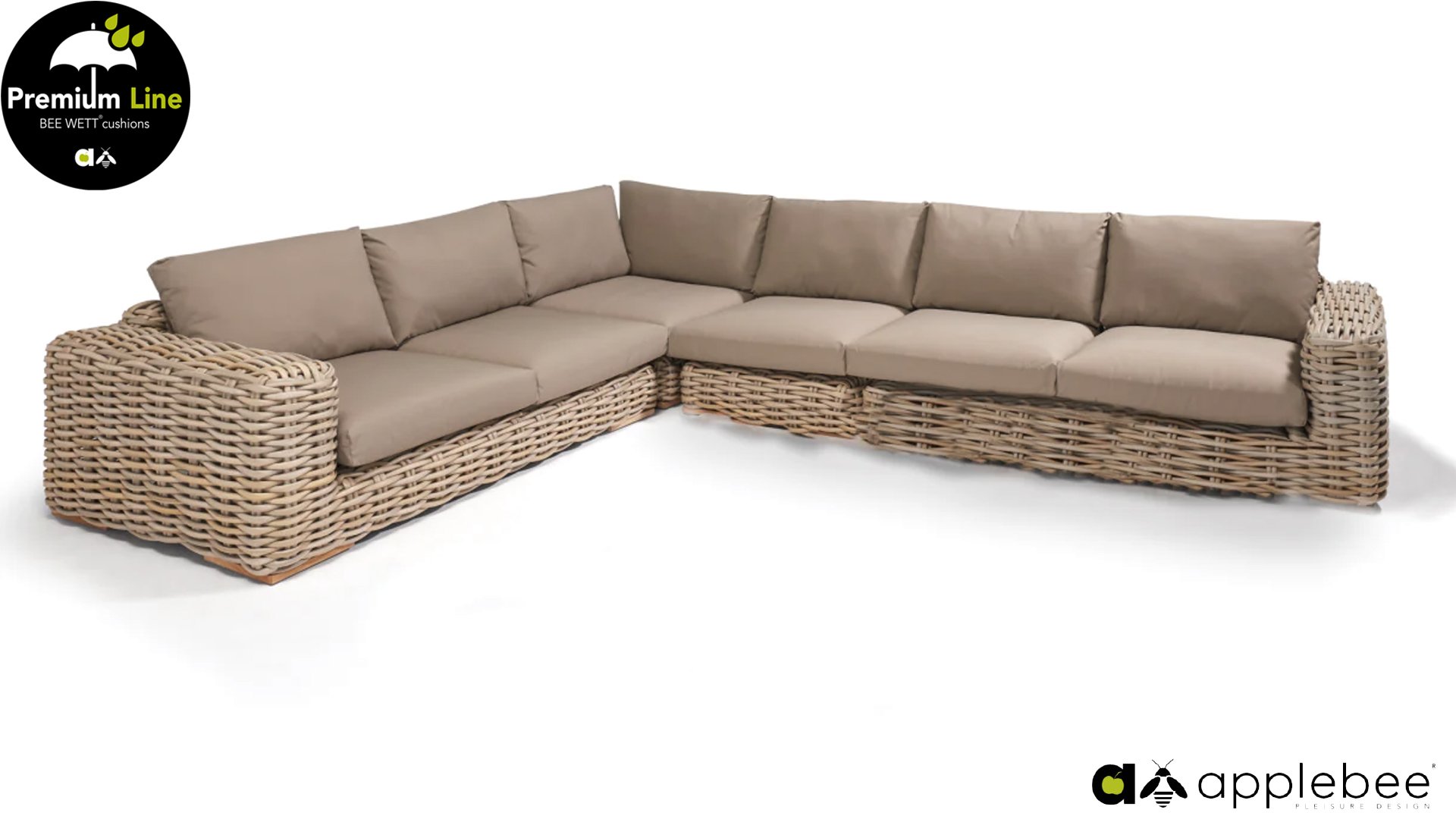 Dit geeft een totaal nieuwe, hippe en stoere look waardoor vlechtwerk alles behalve oubollig is. Eerder tijdloos! Extra dikke kussens in een luxe, fluffy uitvoering maken de set af. Bij de premium line zijn de kussens voorzien van Bee Wett® technologie, wat ervoor zorgt dat de kussens weer snel droog zijn na een fikse regenbui. Je kunt de kussens dus gewoon buiten laten liggen. De drainage aan de onderzijde van het kussen zorgt er namelijk voor dat het water de kussens eenvoudig kan verlaten. In het royale formaat kun je verdwijnen in luxe en comfort. De Apple bee FFF loungeset is daarmee uitermate geschikt om écht te loungen.