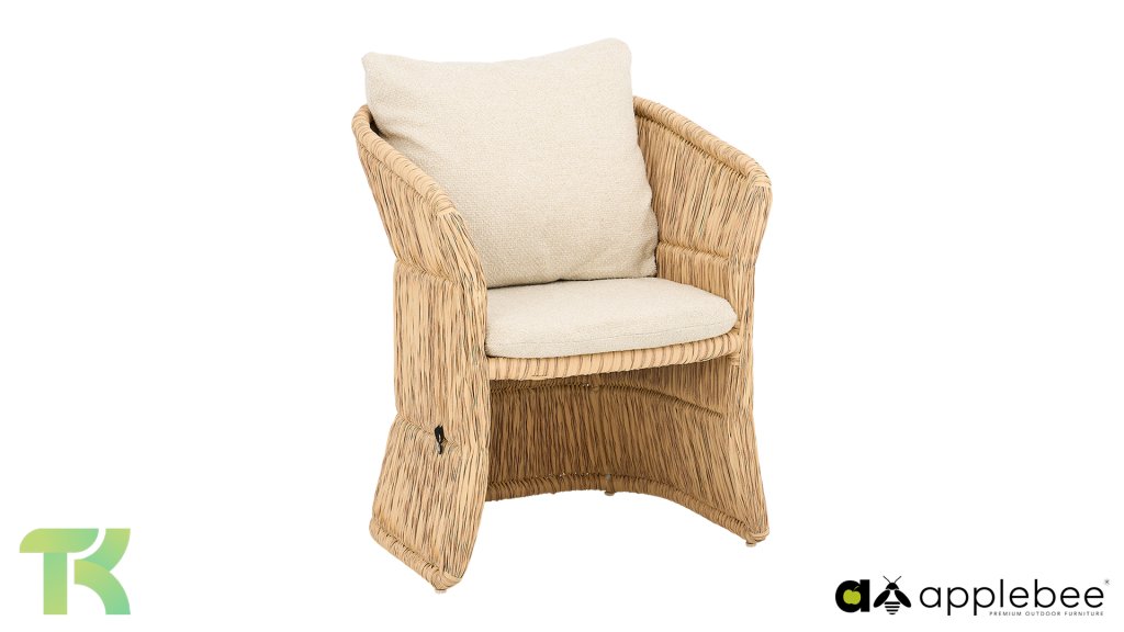Het geheim van de Gili zit in het materiaal: Biculair twisted leaf. Dit dikke, ronde vlechtwerk in een warme, natuurlijke tint geeft de stoel een authentieke riet-look, maar is volledig weersbestendig. De stoel is vormgegeven als een comfortabele kuip met een dichtgevlochten onderstel, wat zorgt voor een solide en rijke uitstraling aan de tuintafel. Dankzij de unieke BeeWett technologie van Apple Bee zijn de kussens vochtregulerend, ademend en drogen ze razendsnel na een zomerse bui.