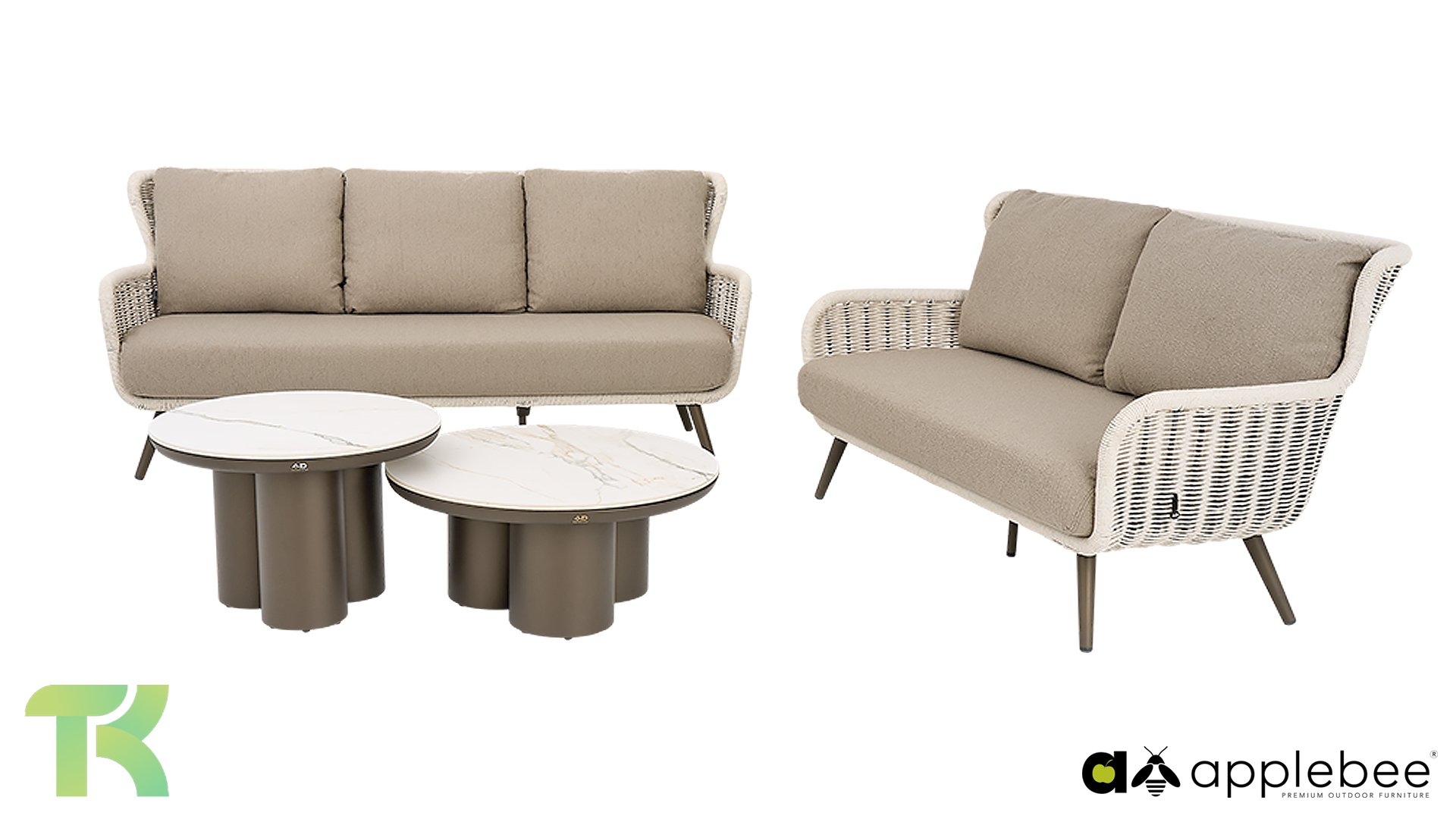 Een verfijnd design met karakter. De Apple Bee Key Largo Lounge valt direct op door zijn prachtige contrasten. Het frame van gepoedercoat aluminium in de chique kleur Bronze vormt een stevige maar elegante basis. Dit wordt gecombineerd met verfijnd Biculair® Weaving Twist-vlechtwerk in de kleur Ivory. Het Biculair®-draad is zonder onderbrekingen in één gebogen lijn doorgevlochten tot onder de zitting. Dit vlechtwerk, met de uitstraling van luxe touw, geeft de set een landelijk bohemiaans karakter dat in elke tuin tot zijn recht komt.