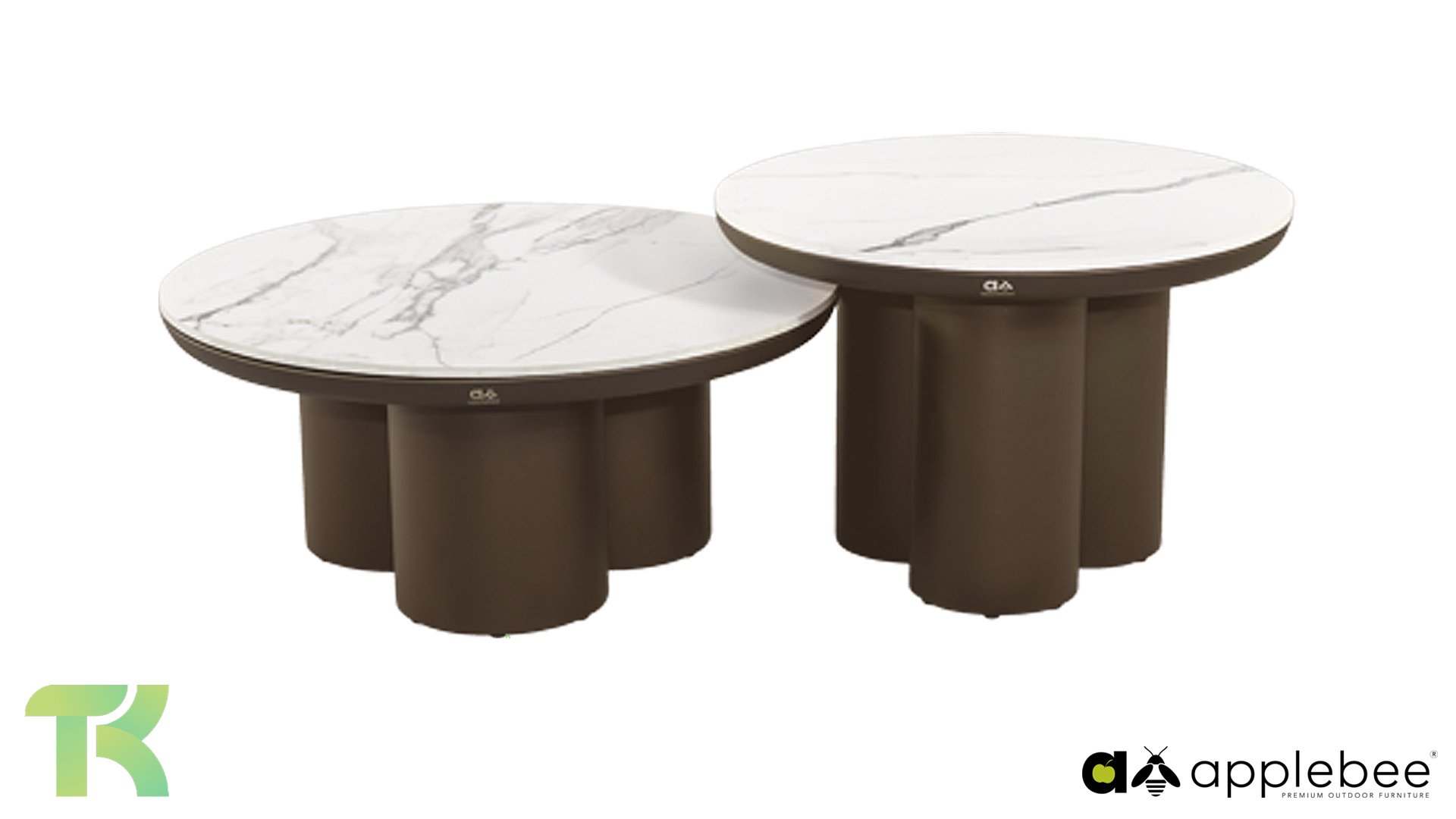 Ontdek de Apple Bee Tonga salontafel set, de perfecte combinatie van een robuuste uitstraling en moderne luxe. Deze set, bestaande uit twee tafels (Ø80x36cm en Ø60x44cm), voegt diepte en dynamiek toe aan elke loungehoek. De bladen van hoogwaardig Sintered Stone zijn niet alleen prachtig, maar ook duurzaam, kras- en weerbestendig. De tafels rusten op een solide onderstel van gepoedercoat aluminium.