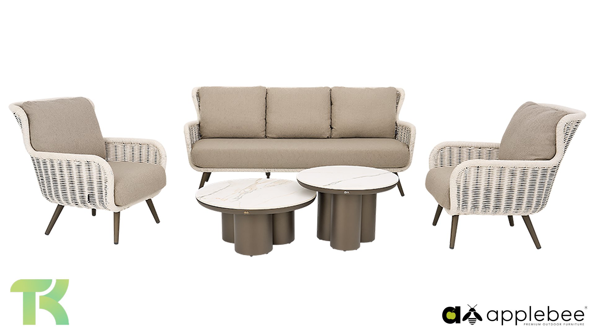 Een verfijnd design met karakter. De Apple Bee Key Largo Lounge valt direct op door zijn prachtige contrasten. Het frame van gepoedercoat aluminium in de chique kleur Bronze vormt een stevige maar elegante basis. Dit wordt gecombineerd met verfijnd Biculair® Weaving Twist-vlechtwerk in de kleur Ivory. Het Biculair®-draad is zonder onderbrekingen in één gebogen lijn doorgevlochten tot onder de zitting. Dit vlechtwerk, met de uitstraling van luxe touw, geeft de set een landelijk bohemiaans karakter dat in elke tuin tot zijn recht komt.