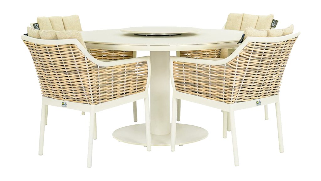 De meisjesnaam Milou betekent zacht en vriendelijk. Het vlechtdraad van de Apple Bee Milou Oyster Dining heeft de uitstraling van wilgenteen. Natuurgetrouw om te zien, maar in de bekende stevige Biculair® buitenkwaliteit die u van Apple Bee gewend bent. Dit vlechtwerk wordt omlijst door een oyster gepoedercoat frame met gebogen lijnen, waaraan tuinset Milou haar chique, moderne look ontleent.