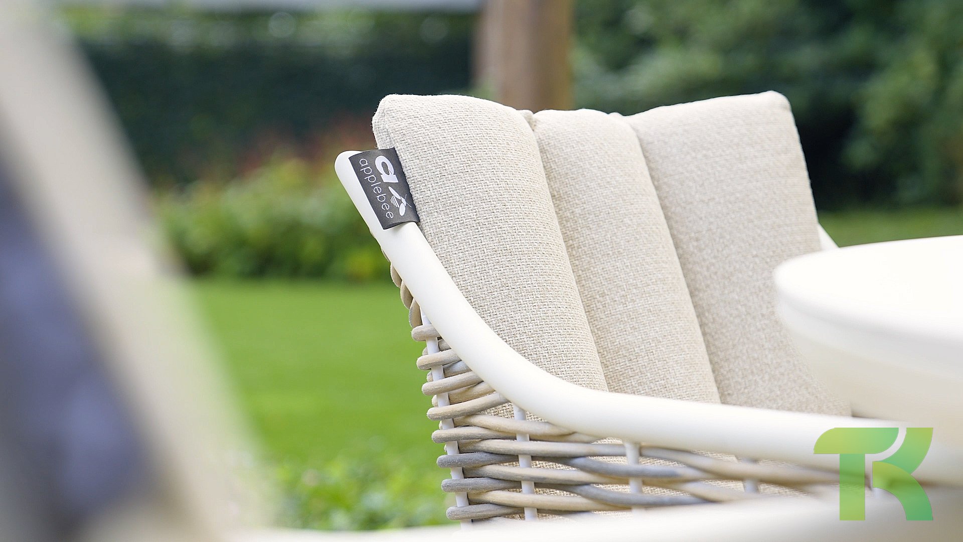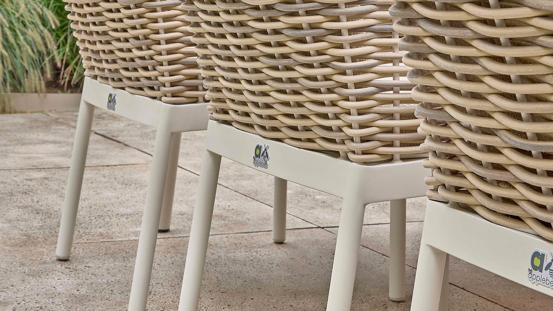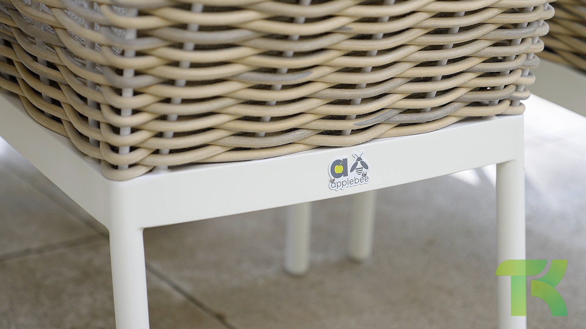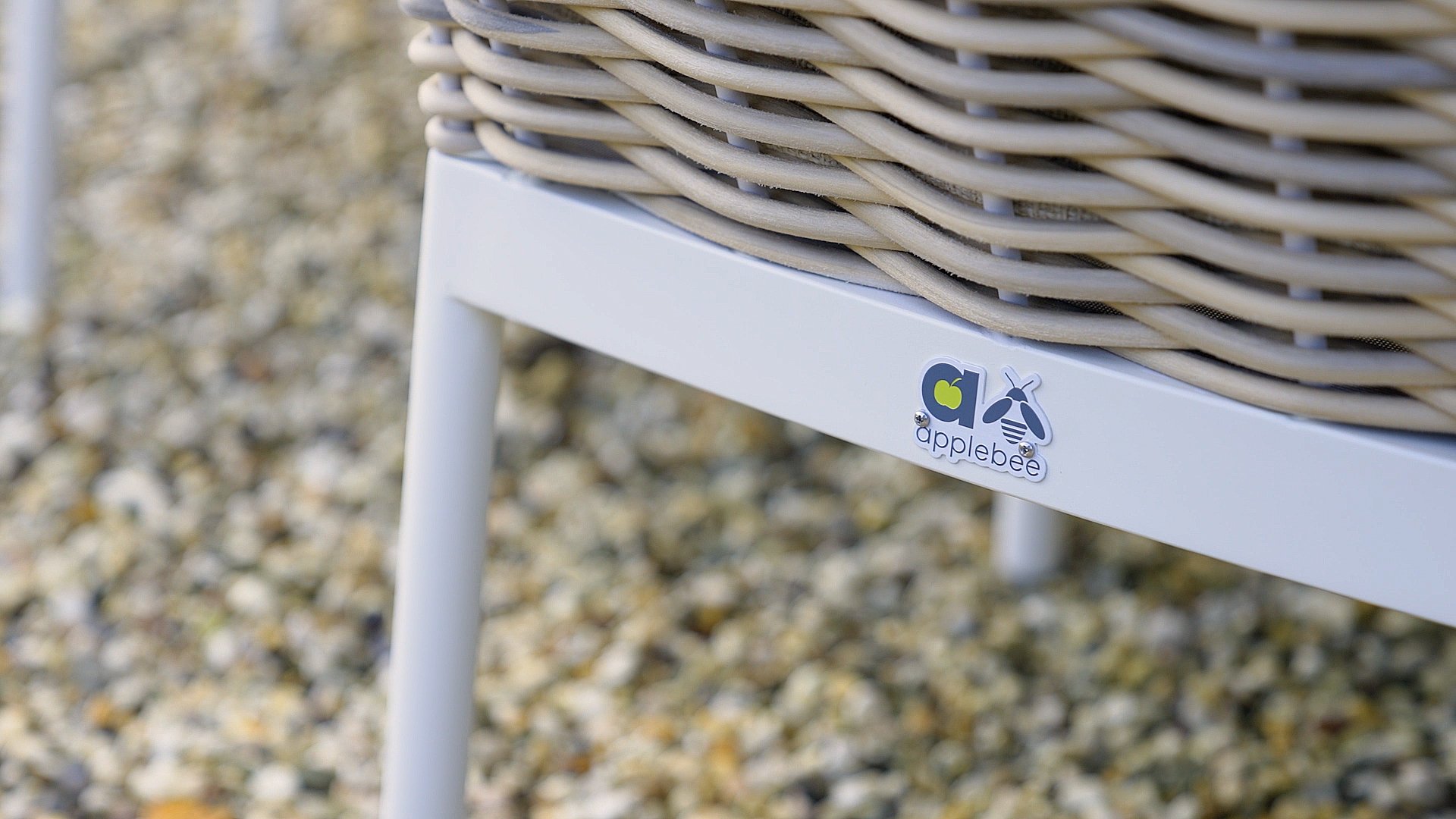 Kenmerkend voor Apple Bee is het gebruik van speciaal Biculair® vlechtwerk, oorspronkelijk ontwikkeld voor professionele toepassingen in de horeca. Dit Biculair® vlechtwerk is een natuurgetrouw, duurzaam alternatief voor rotan. Deze zeer duurzame synthetische rotanvezel (HDPE) is volledig weerbestendig, kleurecht, recyclebaar en dus een milieuvriendelijke keuze. Het uiterlijk en de prestaties van het meubilair blijven dus onaangetast door de Europese weersomstandigheden en de kleuren behouden hun natuurlijke levendigheid. De superieure kwaliteit van dit vlechtwerk, gecontroleerd door de Nederlandse Organisatie voor Toegepast Natuurwetenschappelijk Onderzoek (TNO), is duidelijk in vergelijking met andere vergelijkbare materialen.