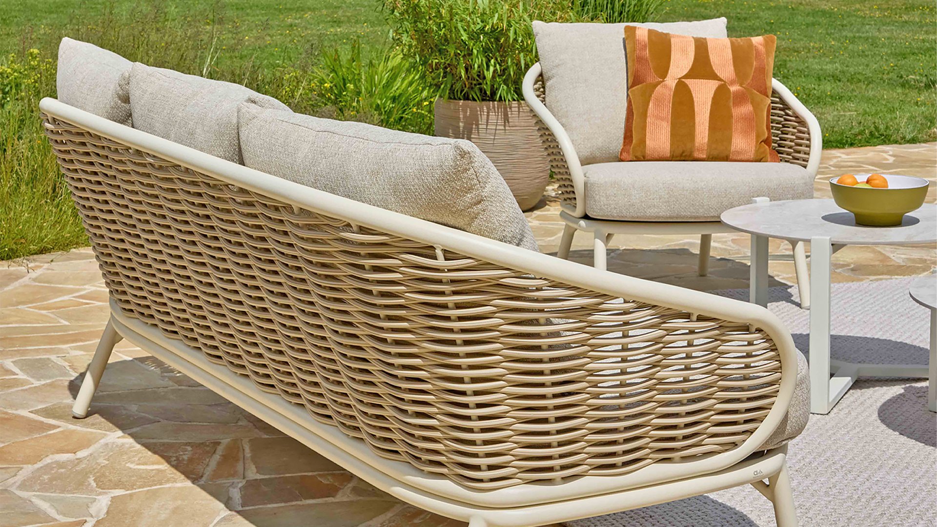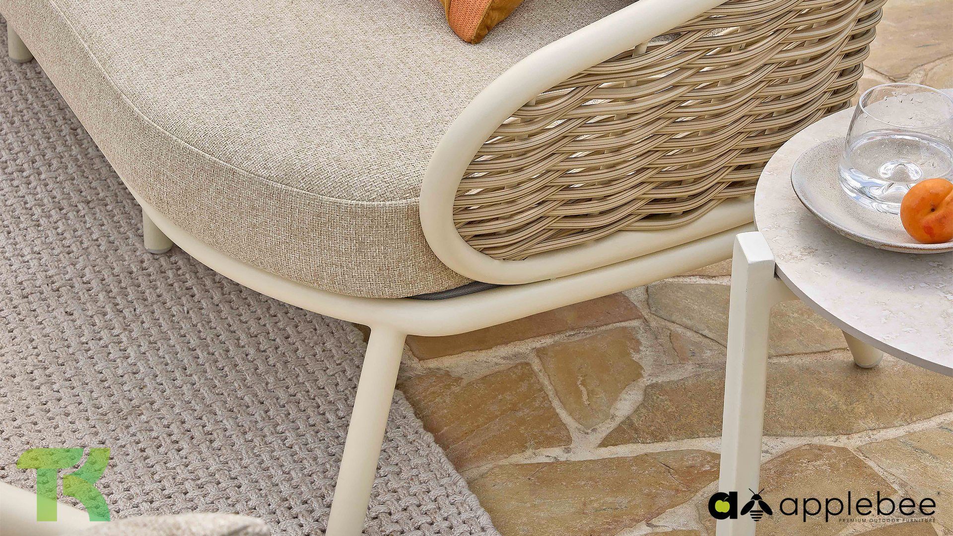 De basis van deze set wordt gevormd door een verfijnd frame van gepoedercoat aluminium in de stijlvolle kleur Oyster. Dit zorgt niet alleen voor een chique, matte finish, maar garandeert ook een lange levensduur. Het frame wordt prachtig gecomplimenteerd door het robuuste vlechtwerk in de lichte tint Seashell. De dikke draden zijn op ingenieuze wijze gevlochten, wat zorgt voor een luchtig en ruimtelijk effect dat perfect past in een moderne tuin. Zorgen over een regenbui zijn verleden tijd. De Pine Key is uitgerust met de innovatieve BeeWett® technologie. Deze premium kussens, uitgevoerd in de zachte kleur Cotton flower, zijn weerbestendig, drogen razendsnel en bieden een ongekend zitcomfort.