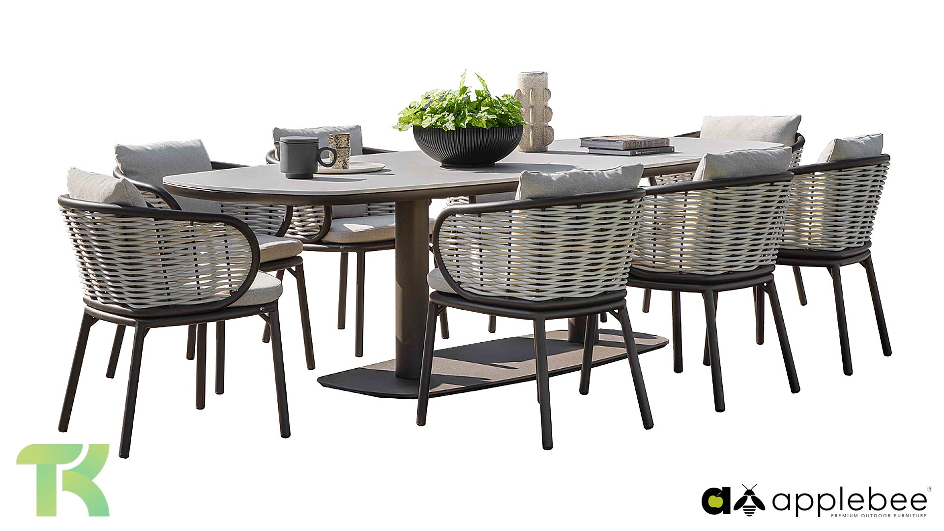 De Apple Bee Pine Key Bronze Dining, een meesterwerk van organisch design dat een robuust karakter moeiteloos combineert met een industriële uitstraling. Deze collectie is speciaal ontworpen voor degenen die buiten net zo stijlvol willen tafelen als binnen.