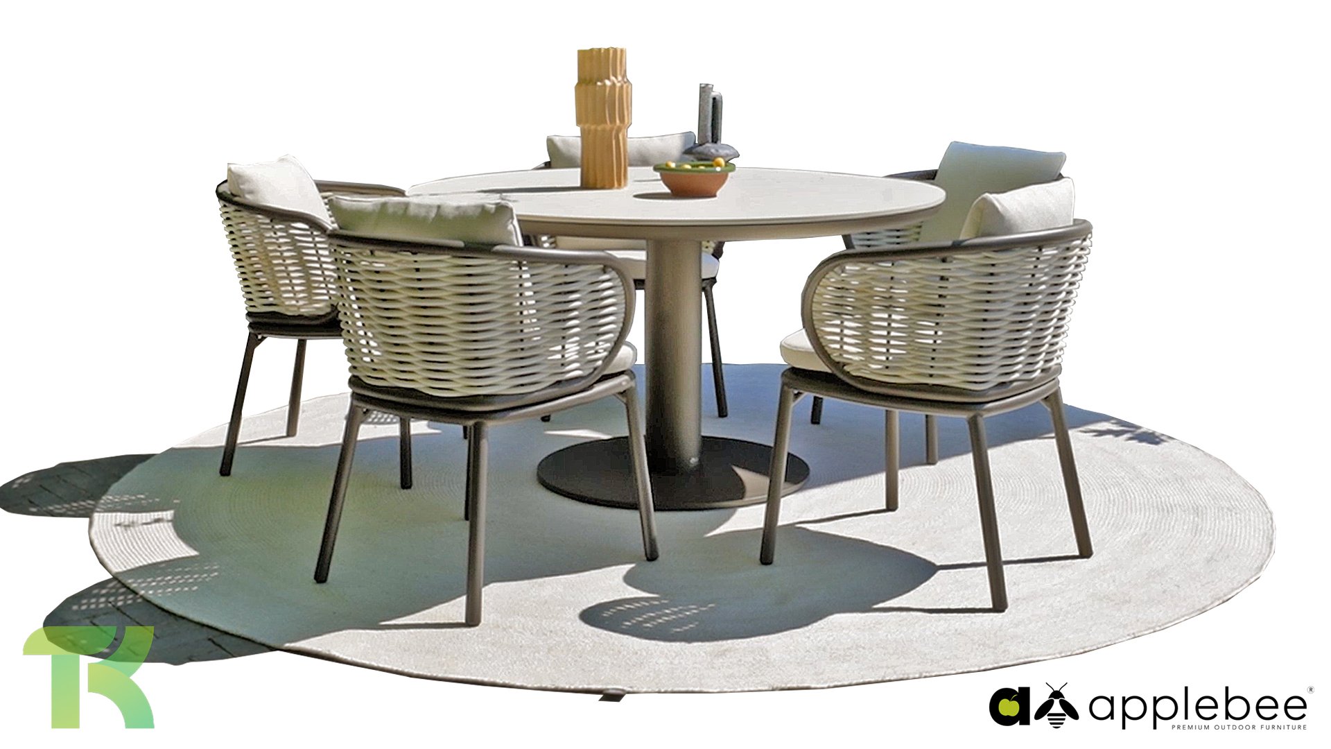 Kenmerkend voor Apple Bee is het gebruik van speciaal Biculair® vlechtwerk, oorspronkelijk ontwikkeld voor professionele toepassingen in de horeca. Dit Biculair® vlechtwerk is een natuurgetrouw, duurzaam alternatief voor rotan. Deze zeer duurzame synthetische rotanvezel (HDPE) is volledig weerbestendig, kleurecht, recyclebaar en dus een milieuvriendelijke keuze. Het uiterlijk en de prestaties van het meubilair blijven dus onaangetast door de Europese weersomstandigheden en de kleuren behouden hun natuurlijke levendigheid. De superieure kwaliteit van dit vlechtwerk, gecontroleerd door de Nederlandse Organisatie voor Toegepast Natuurwetenschappelijk Onderzoek (TNO), is duidelijk in vergelijking met andere vergelijkbare materialen.