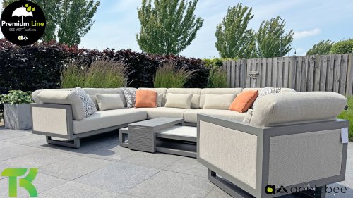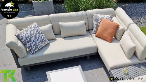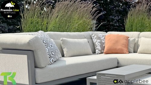 Apple Bee Santorini Lounge: Wanneer je houdt van een strakke en kubistische loungeset, maar niets wilt inleveren op eigenzinnigheid… zie hier, de Santorini! Een strak, aluminium vierkant buisframe, gepoedercoat in warm taupe. Deze set is er in twee uitvoeringen. Het verschil zit in de panelen in de armen en de rug, die door het frame als een schilderij omlijst lijken te worden. Bij de eerste uitvoering is het paneel met prachtig gemêleerd rope omwikkeld. Hierdoor houdt de set luchtigheid met een eigentijdse look. De andere uitvoering heeft gestoffeerde panelen in de zelfde stof als de kussens. Hierdoor krijgt de set direct meer klasse en luxe.