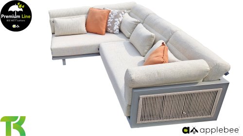 Apple Bee Santorini Lounge Rope: Wanneer je houdt van een strakke en kubistische loungeset, maar niets wilt inleveren op eigenzinnigheid… zie hier, de Santorini! Een strak, aluminium vierkant buisframe, gepoedercoat in warm taupe. Deze set is er in twee uitvoeringen. Het verschil zit in de panelen in de armen en de rug, die door het frame als een schilderij omlijst lijken te worden. Bij de eerste uitvoering is het paneel met prachtig gemêleerd rope omwikkeld. Hierdoor houdt de set luchtigheid met een eigentijdse look. De andere uitvoering heeft gestoffeerde panelen in de zelfde stof als de kussens. Hierdoor krijgt de set direct meer klasse en luxe.
