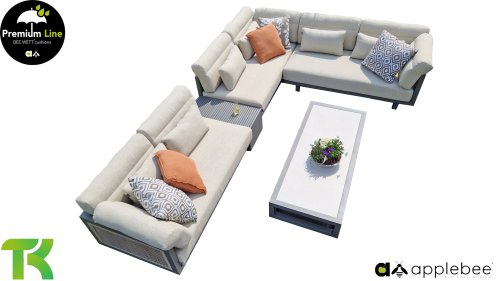 De AppleBee Santorini Salontafel Set, waarvan het onderstel aluminium is in de kleur Quartz. Het blad van de 155cm tafel is keramiek in de kleur Travetino. Het is een elegante combinatie, vooral met de AppleBee Santorini Loungeset!