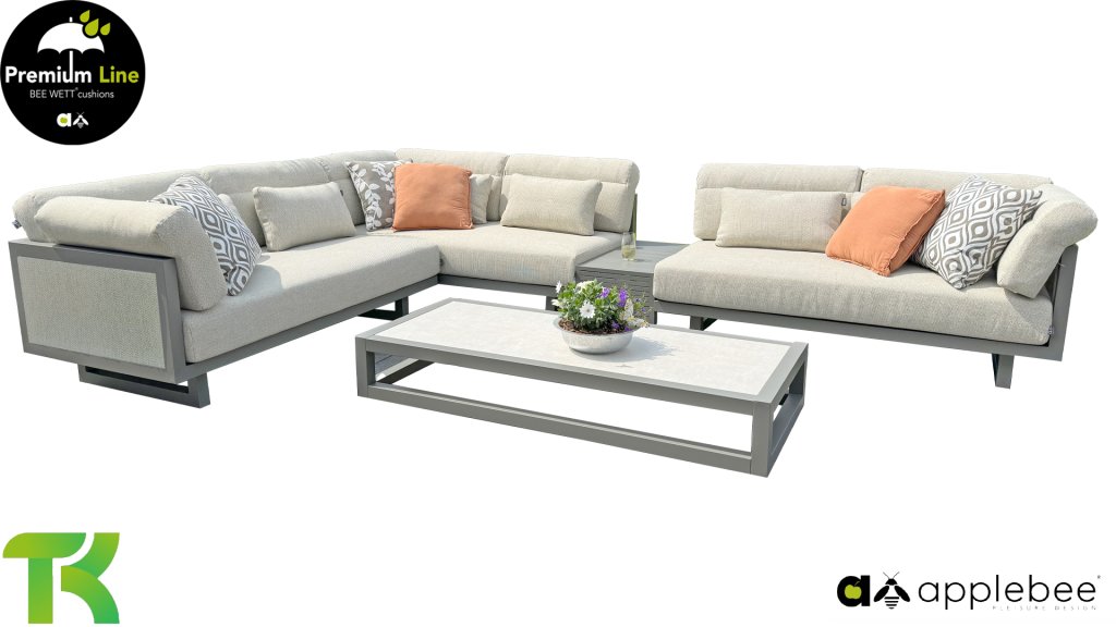 De Apple Bee Santorini Salontafel Set, waarvan het onderstel aluminium is in de kleur Quartz. Het blad van de 155cm tafel is keramiek in de kleur Travetino. Het is een elegante combinatie, vooral met de Apple Bee Santorini Loungeset!