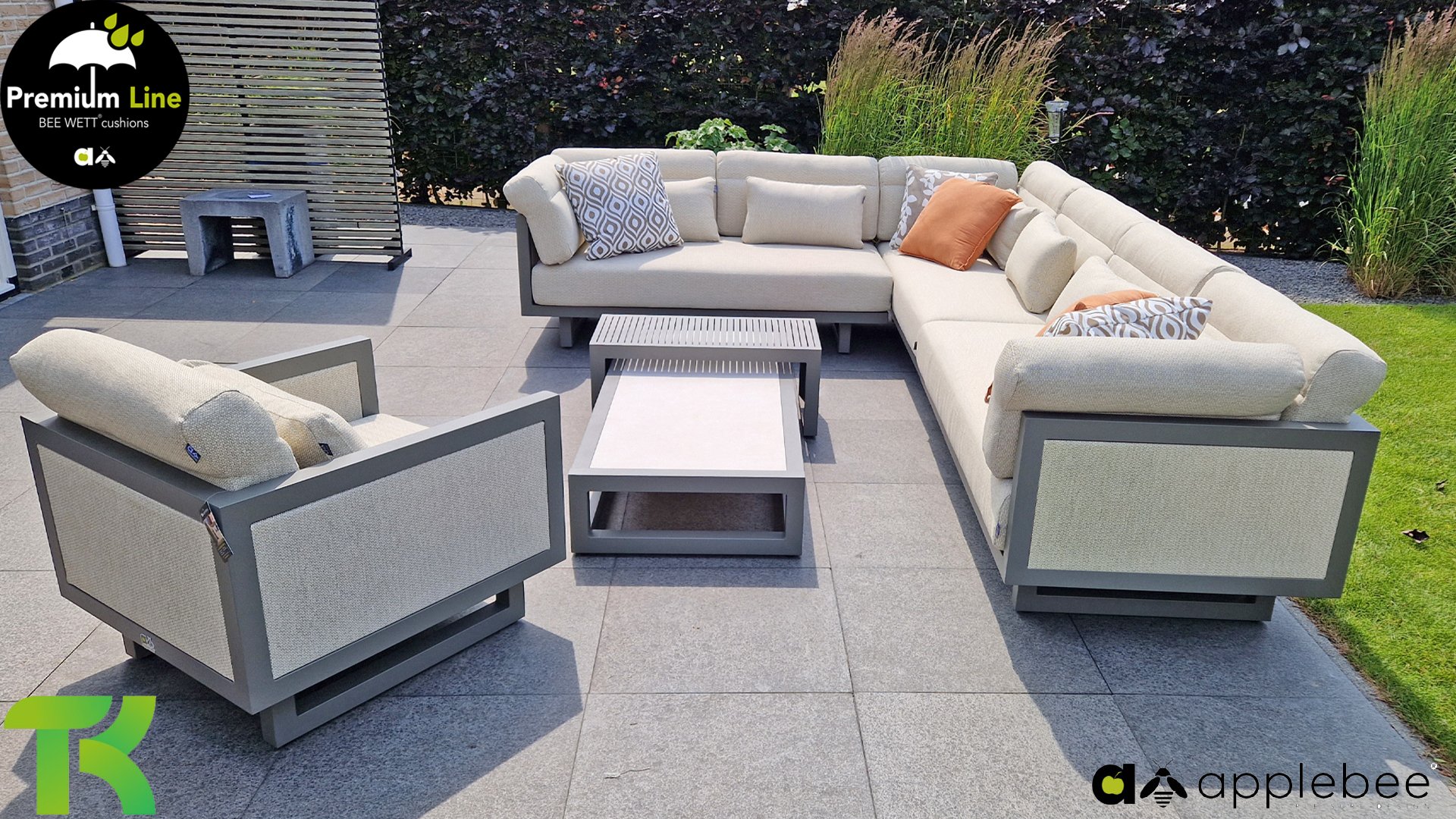 Apple Bee Santorini Lounge: Wanneer je houdt van een strakke en kubistische loungeset, maar niets wilt inleveren op eigenzinnigheid… zie hier, de Santorini! Een strak, aluminium vierkant buisframe, gepoedercoat in warm taupe. Deze set is er in twee uitvoeringen. Het verschil zit in de panelen in de armen en de rug, die door het frame als een schilderij omlijst lijken te worden. Bij de eerste uitvoering is het paneel met prachtig gemêleerd rope omwikkeld. Hierdoor houdt de set luchtigheid met een eigentijdse look. De andere uitvoering heeft gestoffeerde panelen in de zelfde stof als de kussens. Hierdoor krijgt de set direct meer klasse en luxe.