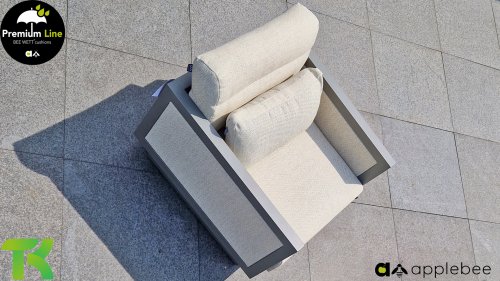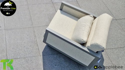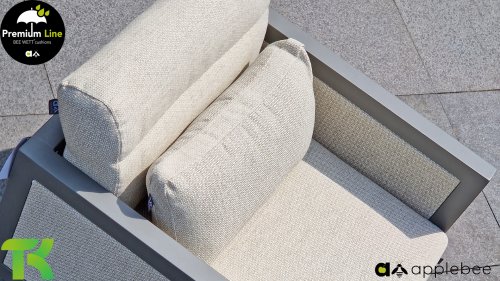 Apple Bee Santorini Lounge: Wanneer je houdt van een strakke en kubistische loungeset, maar niets wilt inleveren op eigenzinnigheid… zie hier, de Santorini! Een strak, aluminium vierkant buisframe, gepoedercoat in warm taupe. Deze set is er in twee uitvoeringen. Het verschil zit in de panelen in de armen en de rug, die door het frame als een schilderij omlijst lijken te worden. Bij de eerste uitvoering is het paneel met prachtig gemêleerd rope omwikkeld. Hierdoor houdt de set luchtigheid met een eigentijdse look. De andere uitvoering heeft gestoffeerde panelen in de zelfde stof als de kussens. Hierdoor krijgt de set direct meer klasse en luxe.