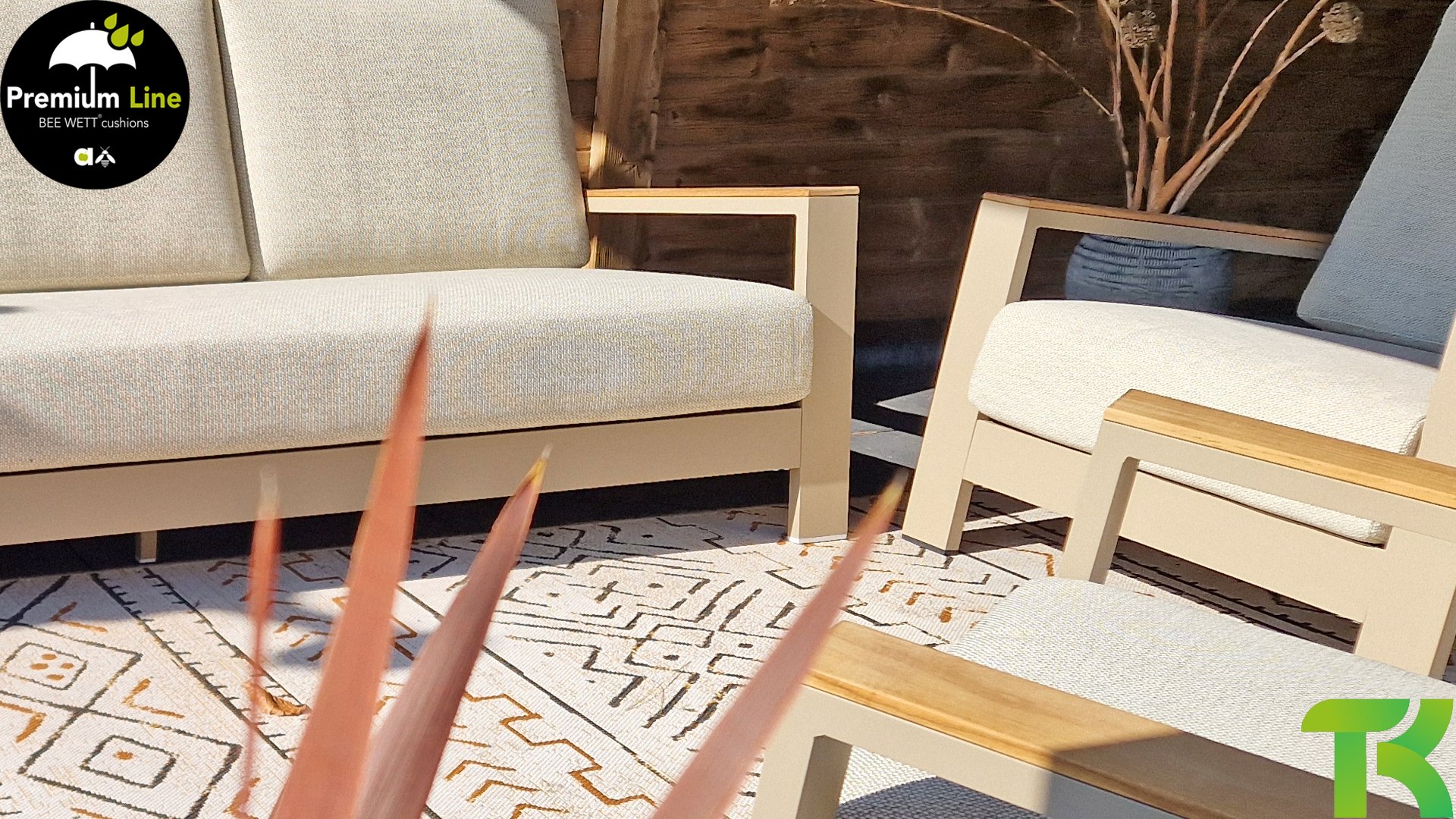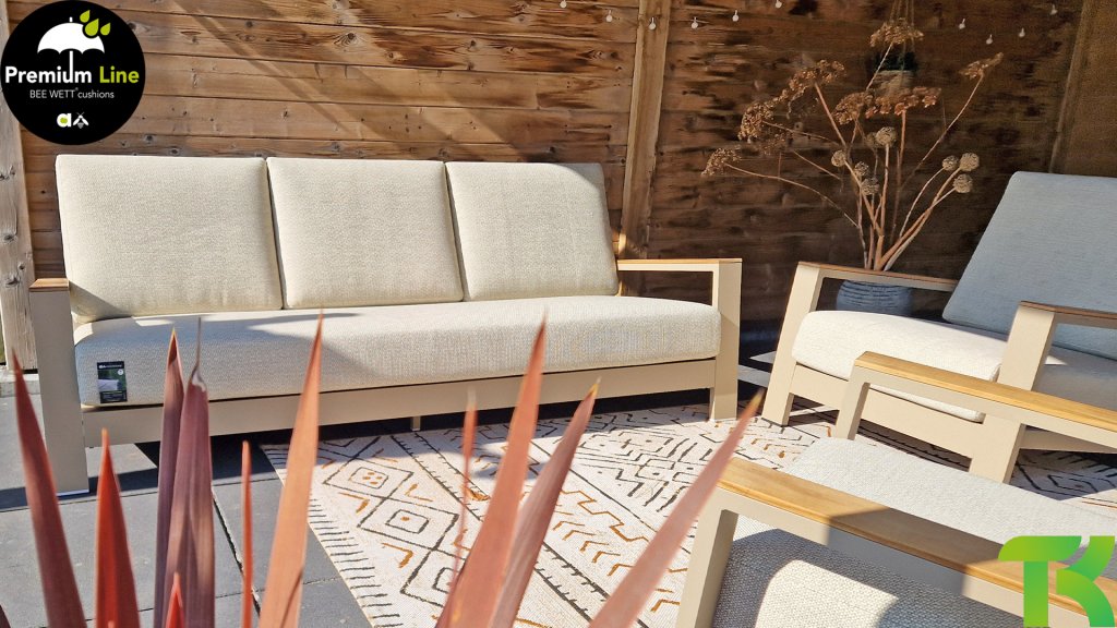 De Apple Bee Spring aluminium latte collectie is minimalistisch en clean, maar springt toch in het oog door een bijzondere vormgeving. Een strak diagonaal lijnenspel, vakkundig verwerkt aluminium, gepoedercoat in een mooie taupe kleur en zachte, comfortabele kussens in een zandkleurige stoffering. Een vleugje teak op de leuning maakt de set af en geeft net dat extra detail. Met aankleding in je eigen stijl, geef je in een oogwenk jouw draai aan dit ‘nestje in de zon’.
