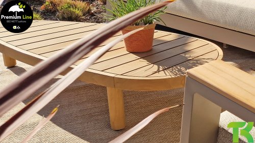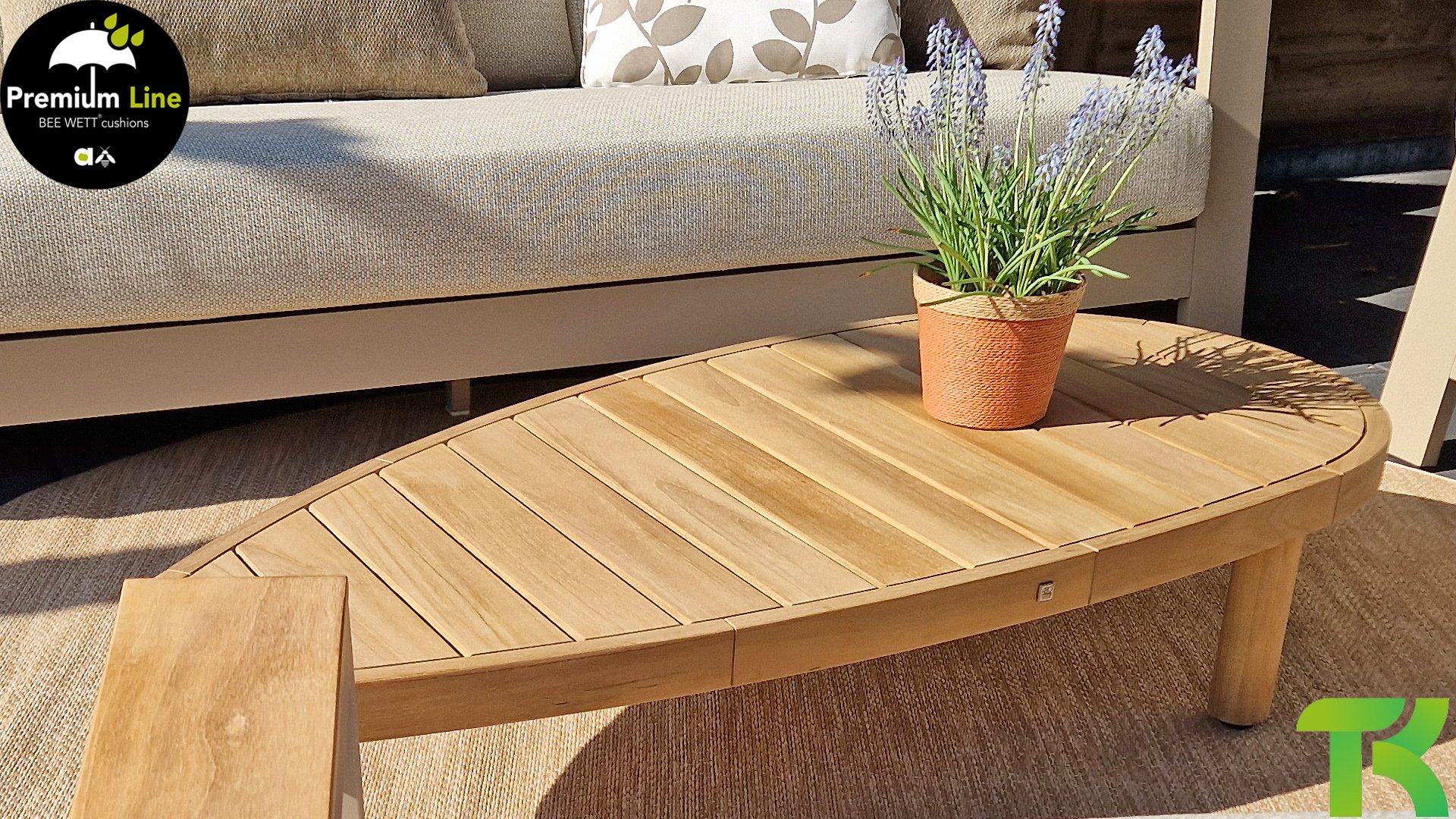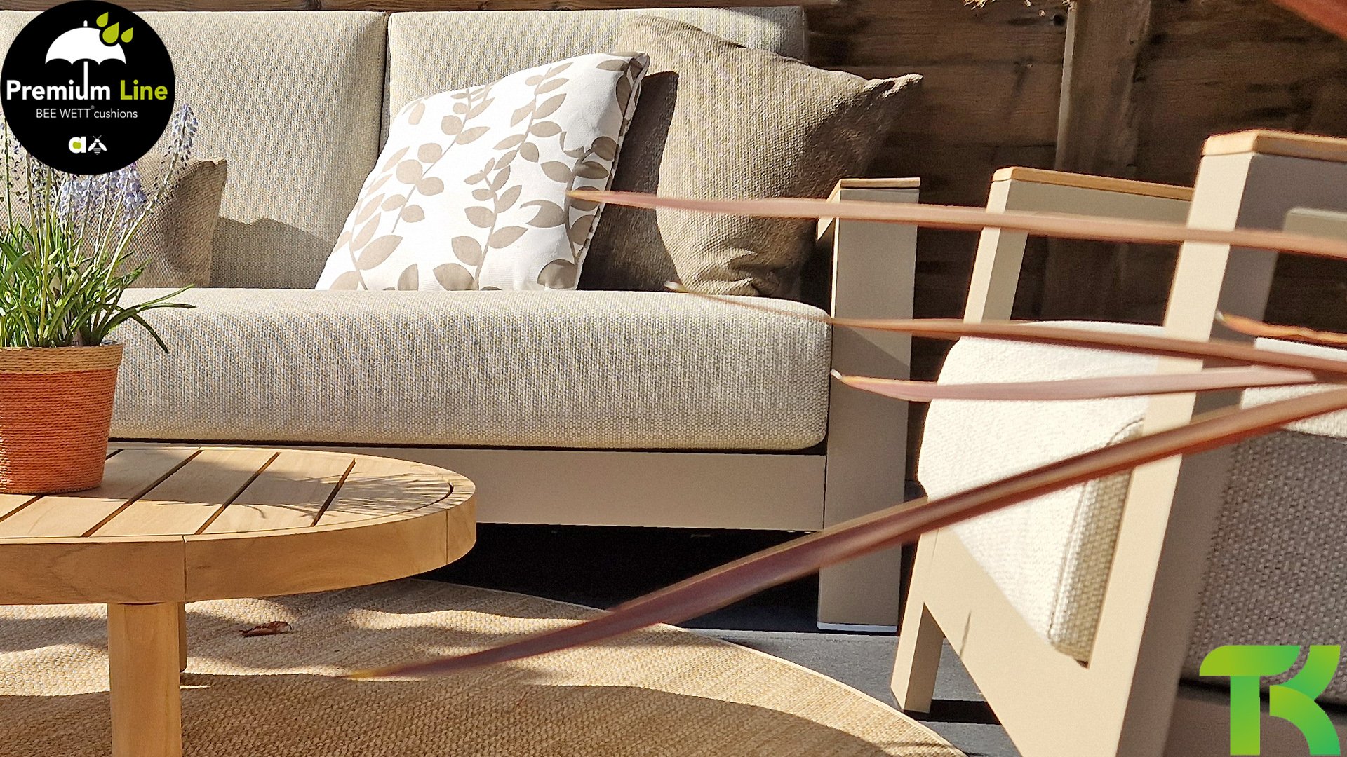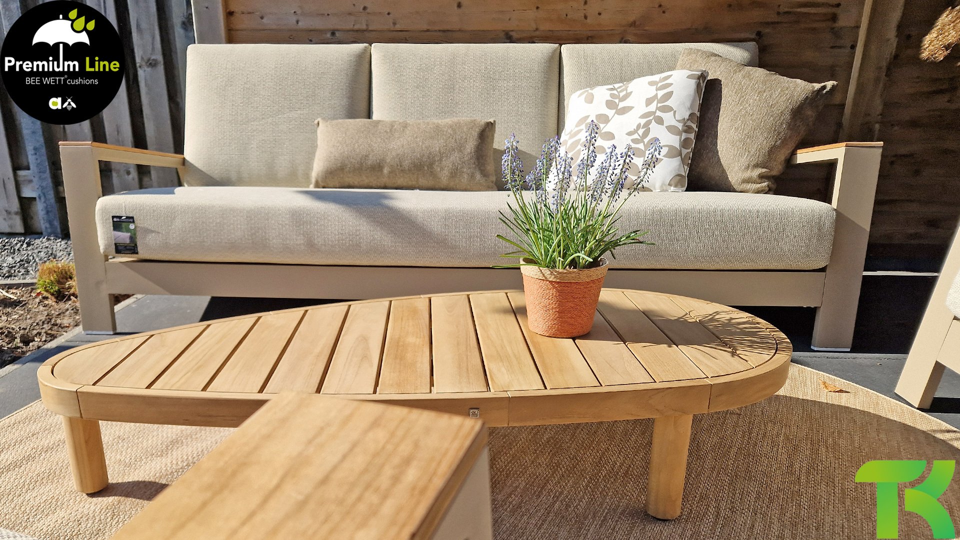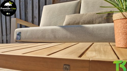 Een strak diagonaal lijnenspel, vakkundig verwerkt aluminium, gepoedercoat in een mooie taupe kleur en zachte, comfortabele kussens in een zandkleurige stoffering. Een vleugje teak op de leuning maakt de set af en geeft net dat extra detail. Met aankleding in je eigen stijl, geef je in een oogwenk jouw draai aan dit ‘nestje in de zon’.