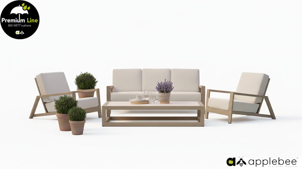 De Apple Bee Spring aluminium latte collectie is minimalistisch en clean, maar springt toch in het oog door een bijzondere vormgeving. Een strak diagonaal lijnenspel, vakkundig verwerkt aluminium, gepoedercoat in een mooie taupe kleur en zachte, comfortabele kussens in een zandkleurige stoffering. Een vleugje teak op de leuning maakt de set af en geeft net dat extra detail. Met aankleding in je eigen stijl, geef je in een oogwenk jouw draai aan dit ‘nestje in de zon’.