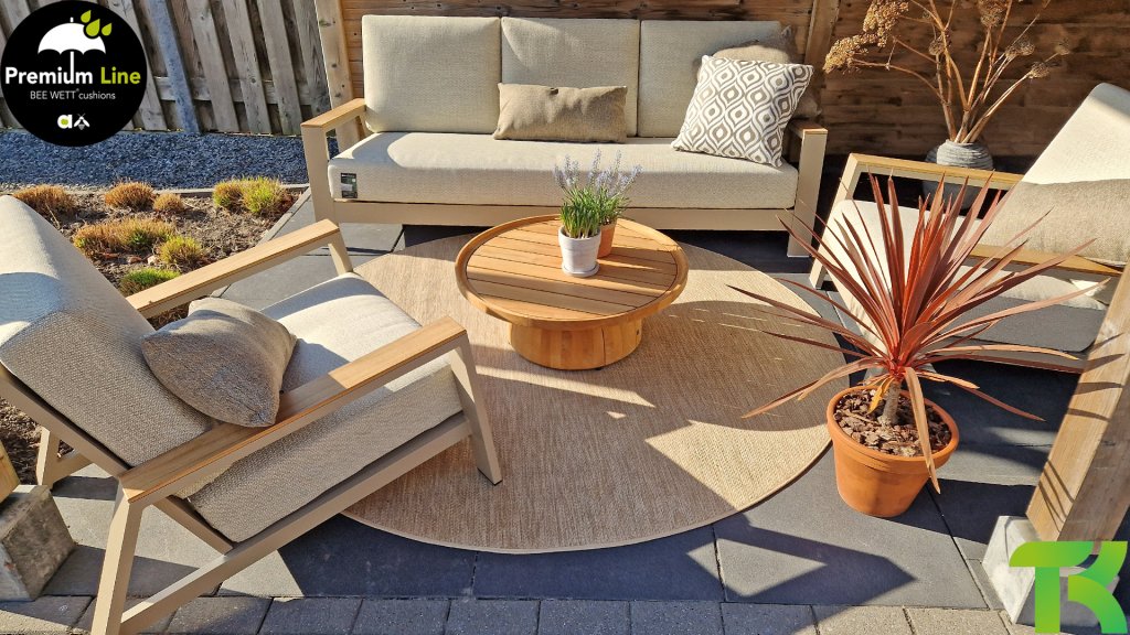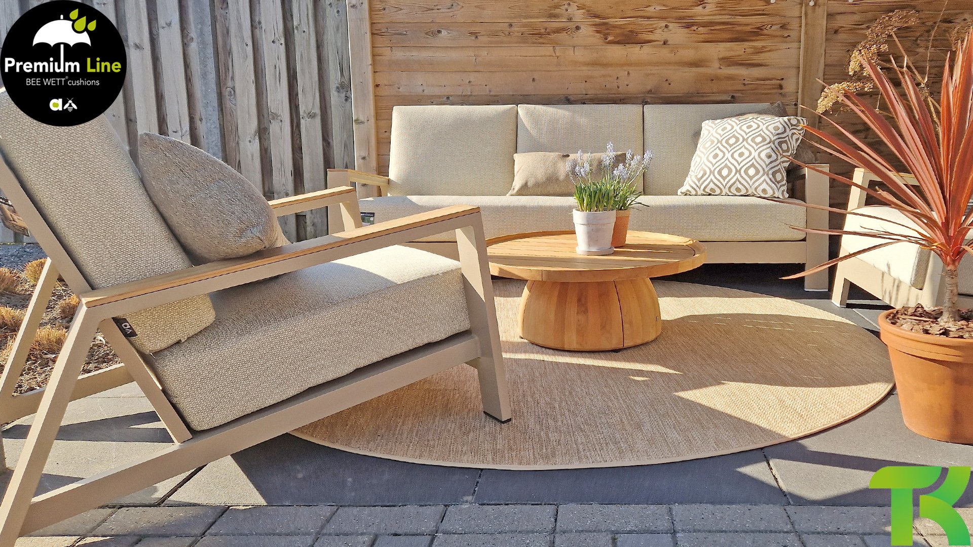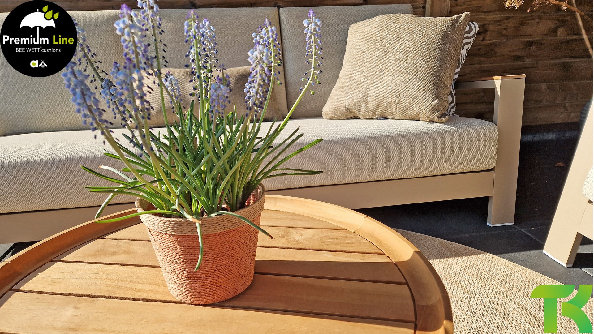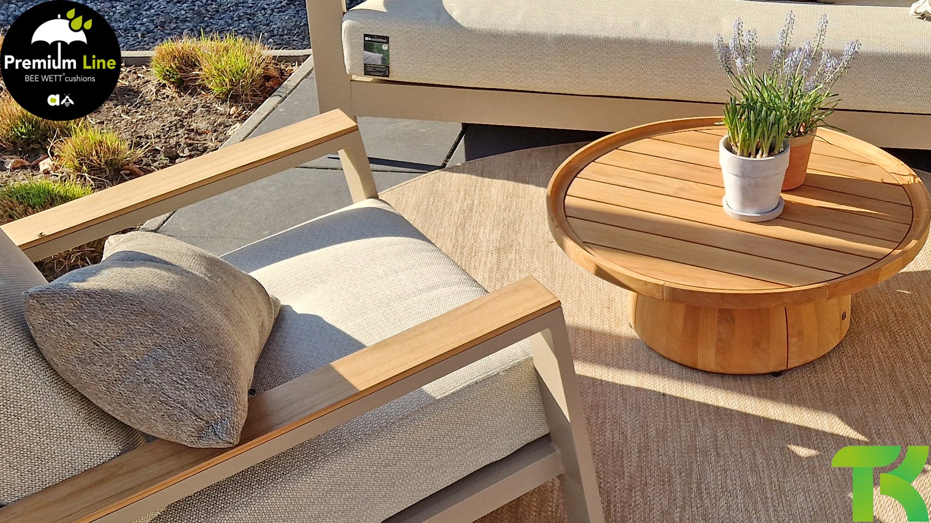 De Apple Bee Spring aluminium latte collectie is minimalistisch en clean, maar springt toch in het oog door een bijzondere vormgeving. Een strak diagonaal lijnenspel, vakkundig verwerkt aluminium, gepoedercoat in een mooie taupe kleur en zachte, comfortabele kussens in een zandkleurige stoffering. Een vleugje teak op de leuning maakt de set af en geeft net dat extra detail. Met aankleding in je eigen stijl, geef je in een oogwenk jouw draai aan dit ‘nestje in de zon’.