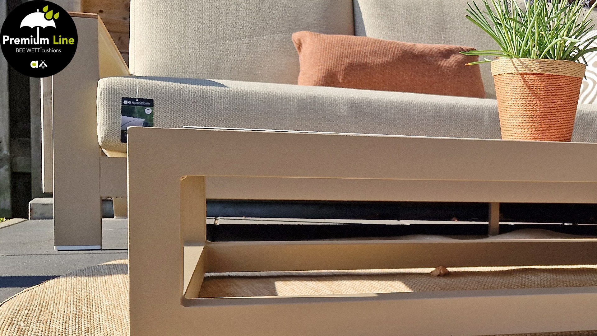 De Apple Bee Spring aluminium latte collectie is minimalistisch en clean, maar springt toch in het oog door een bijzondere vormgeving. Een strak diagonaal lijnenspel, vakkundig verwerkt aluminium, gepoedercoat in een mooie taupe kleur en zachte, comfortabele kussens in een zandkleurige stoffering. Een vleugje teak op de leuning maakt de set af en geeft net dat extra detail. Met aankleding in je eigen stijl, geef je in een oogwenk jouw draai aan dit ‘nestje in de zon’.