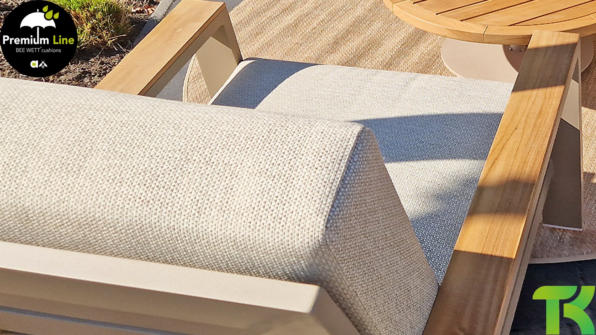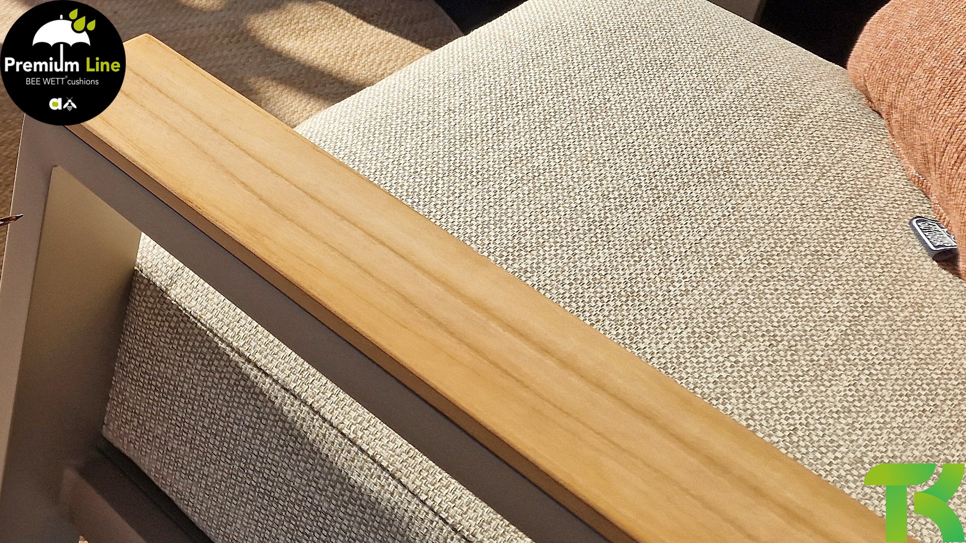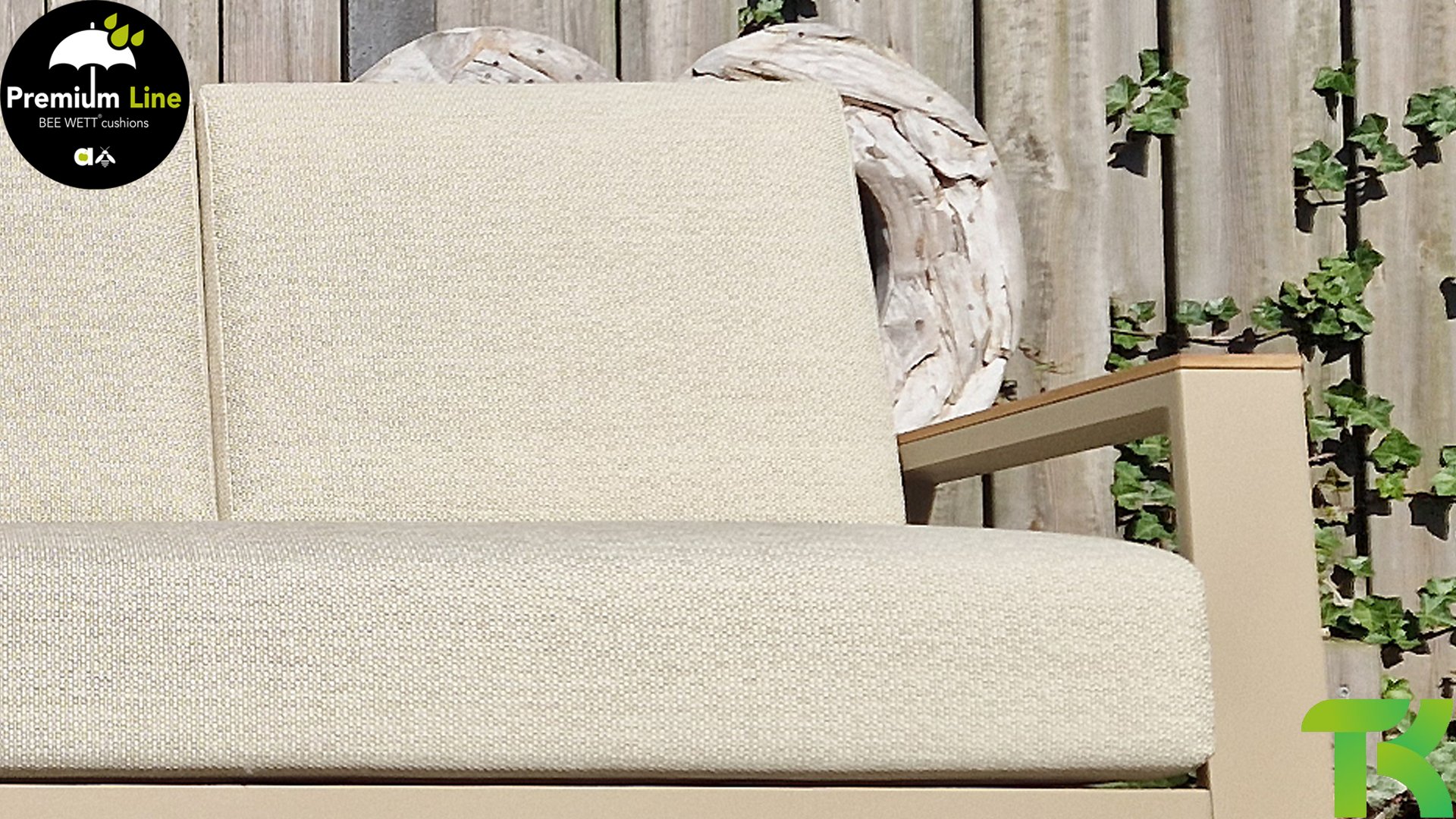 De Apple Bee Spring aluminium latte collectie is minimalistisch en clean, maar springt toch in het oog door een bijzondere vormgeving. Een strak diagonaal lijnenspel, vakkundig verwerkt aluminium, gepoedercoat in een mooie taupe kleur en zachte, comfortabele kussens in een zandkleurige stoffering. Een vleugje teak op de leuning maakt de set af en geeft net dat extra detail. Met aankleding in je eigen stijl, geef je in een oogwenk jouw draai aan dit ‘nestje in de zon’.