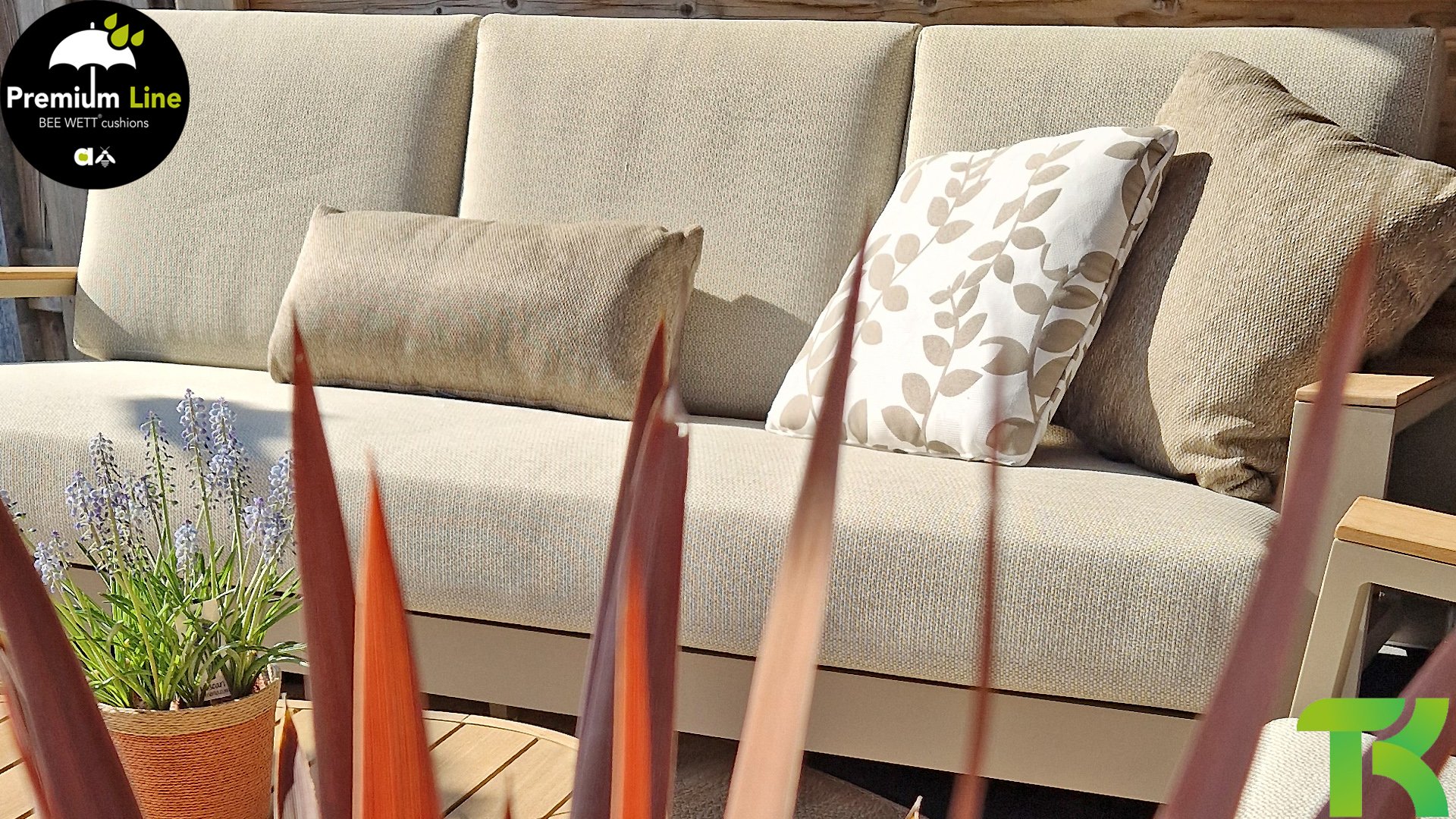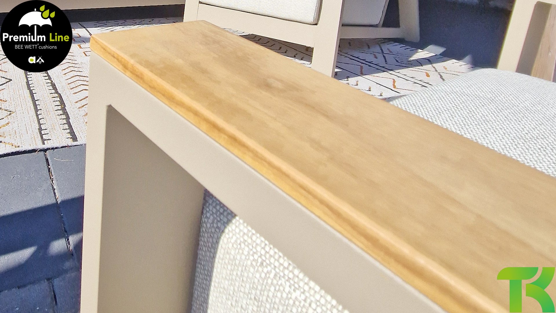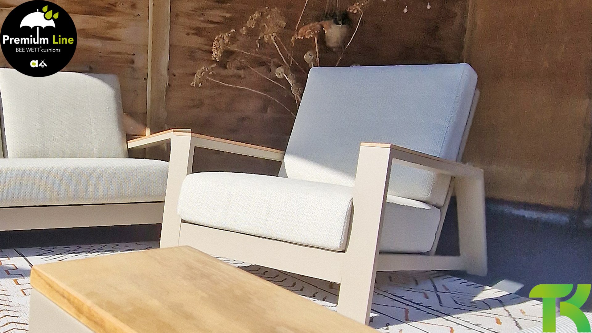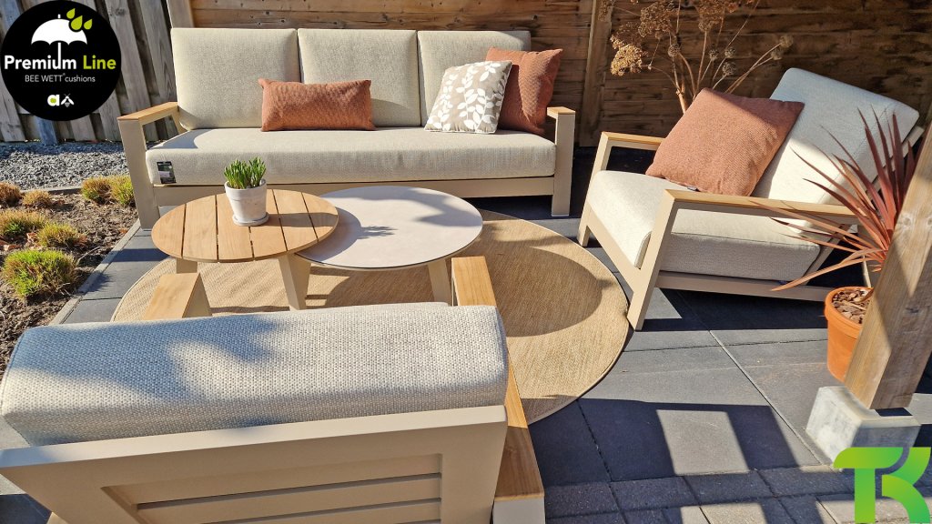 De Apple Bee Spring aluminium latte collectie is minimalistisch en clean, maar springt toch in het oog door een bijzondere vormgeving. Een strak diagonaal lijnenspel, vakkundig verwerkt aluminium, gepoedercoat in een mooie taupe kleur en zachte, comfortabele kussens in een zandkleurige stoffering. Een vleugje teak op de leuning maakt de set af en geeft net dat extra detail. Met aankleding in je eigen stijl, geef je in een oogwenk jouw draai aan dit ‘nestje in de zon’.