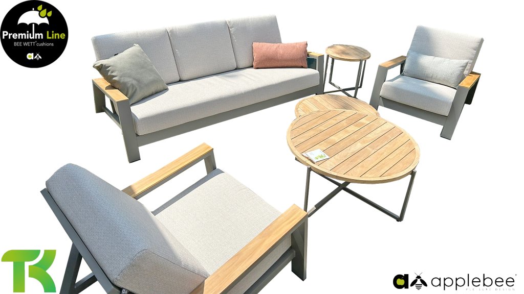 De Apple Bee Spring aluminium taupe collectie is minimalistisch en clean, maar springt toch in het oog door een bijzondere vormgeving. Een strak diagonaal lijnenspel, vakkundig verwerkt aluminium, gepoedercoat in een mooie taupe kleur en zachte, comfortabele kussens in een zandkleurige stoffering. Een vleugje teak op de leuning maakt de set af en geeft net dat extra detail. Met aankleding in je eigen stijl, geef je in een oogwenk jouw draai aan dit ‘nestje in de zon’.