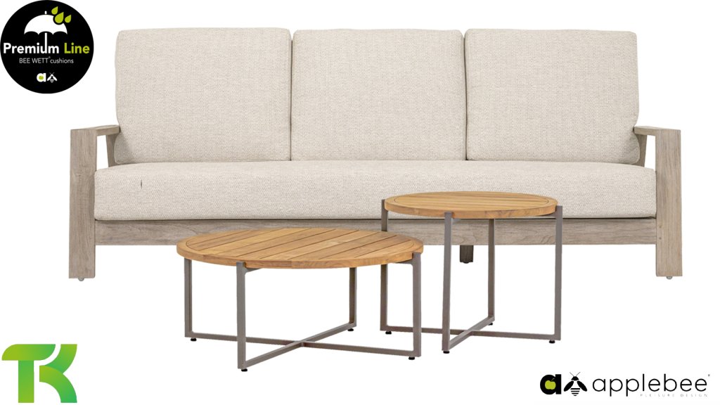 De Apple Bee Spring teak collectie is minimalistisch en clean, maar springt toch in het oog door een bijzondere vormgeving. Een strak diagonaal lijnenspel, ambachtelijk verwerkt teak in een Coastal finish en zachte, comfortabele kussens in de zandkleurige stoffering. De meubelen zijn volledig uit hoogwaardig teak vervaardigd, dus ook wanneer de set zonder kussens in je tuin blijft staan, is deze nog altijd een lust voor het oog. Een ton-sur-ton topper! Met een paar mooie sierkussens naar jouw eigen smaak, creëer je in een oogwenk je eigen stijl voor jouw eigen ‘nestje in de zon’.