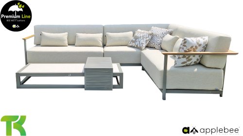 Met de Apple Bee St. Lucia aluminium lounge zit je dan letterlijk en figuurlijk goed… de kussens zijn namelijk maar liefst 25 cm dik! Door de enorme dikke kussens krijgt de St. Lucia direct een heel luxueuze uitstraling. Het aluminium frame in de taupe (Quartz)-kleur heeft mooie ronde poten en een doorlopende arm-/rugleuning. Als finishing touch is de bovenzijde van de leuning afgewerkt met Naturel SVLK teak afwerklat, dit geeft net dat opvallende detail, wat typerend is voor dit Apple Bee design.