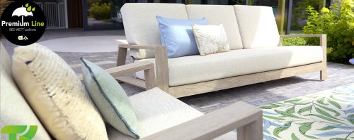 minimalistisch en clean, maar springt toch in het oog door een bijzondere vormgeving. Een strak diagonaal lijnenspel, ambachtelijk verwerkt teak in een Coastal finish en zachte, comfortabele kussens in de zandkleurige stoffering. De meubelen zijn volledig uit hoogwaardig teak vervaardigd, dus ook wanneer de set zonder kussens in je tuin blijft staan, is deze nog altijd een lust voor het oog. Een ton-sur-ton topper! Met een paar mooie sierkussens naar jouw eigen smaak, creëer je in een oogwenk je eigen stijl voor jouw eigen ‘nestje in de zon’.