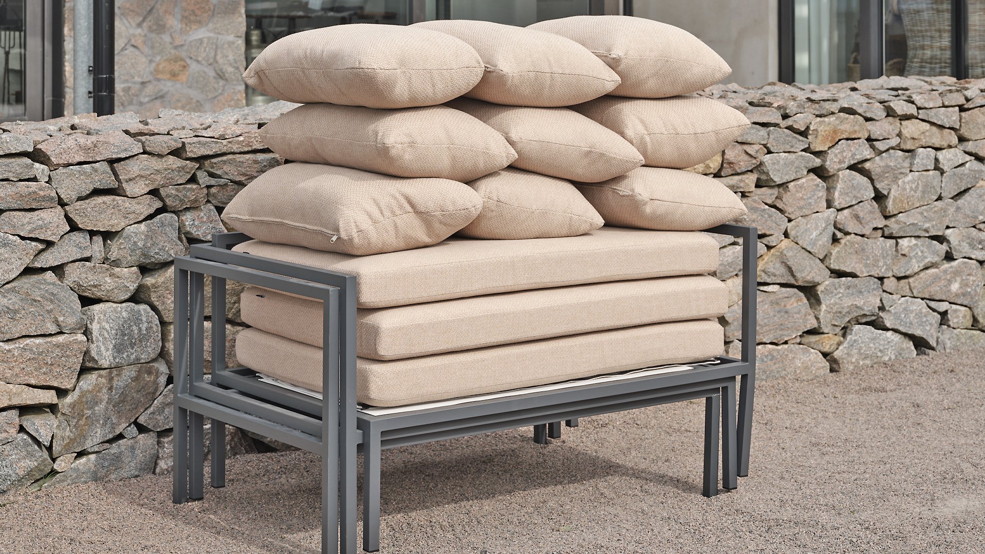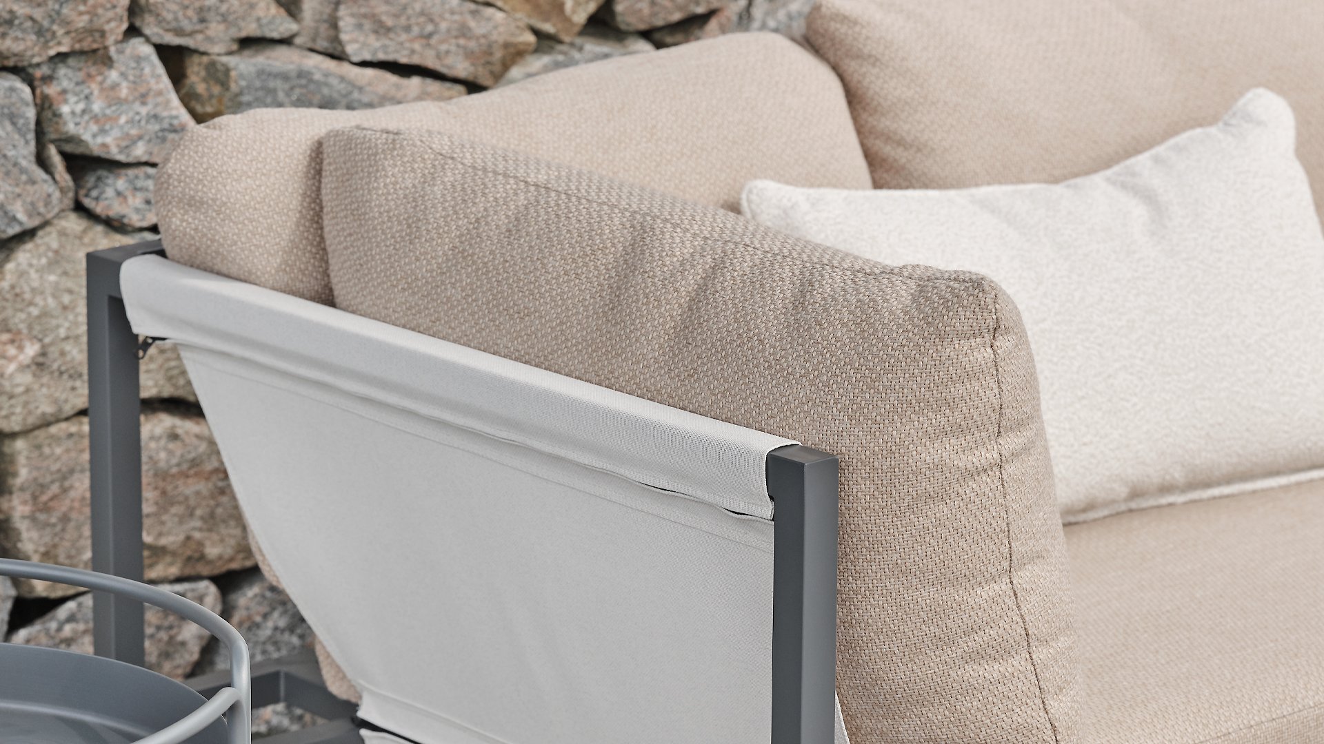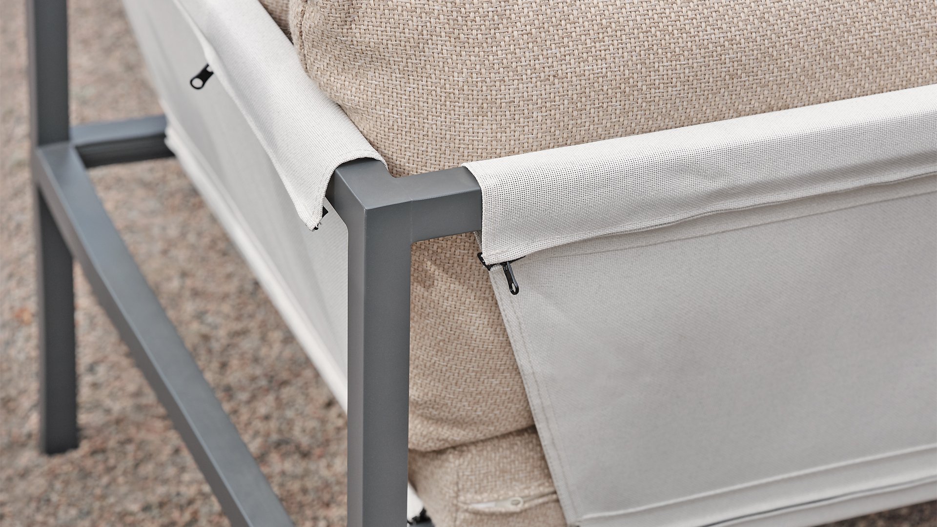 Allie - alles in één doos. Ervaar de perfecte mix van eenvoud en verfijning van het ontwerp, zoals elk element: van het aluminium frame tot de levendige zitting van textiel. Comfortabele kussens in een moderne gerstkleurige stof. - alles wordt netjes verpakt in één doos. Het samenstellen van uw buitenoase was nog nooit zo eenvoudig, zodat u zich kunt concentreren op het genieten van uw ruimte in plaats van op de inrichting. Door de slimme constructie is hij bovendien gemakkelijk op te bergen in de winter.