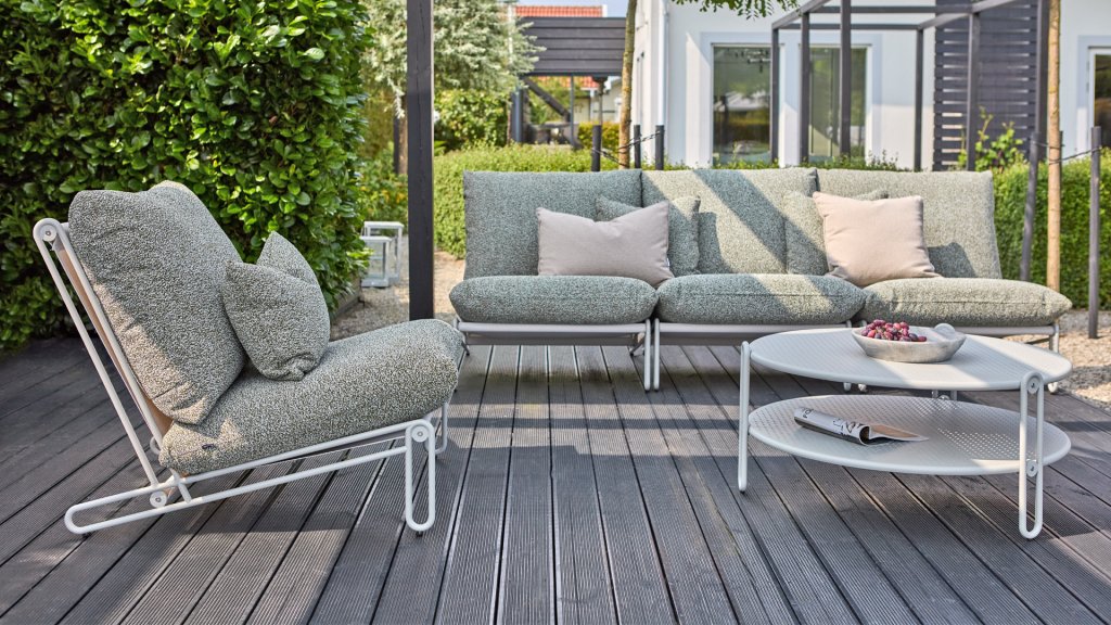 Een comfortabele fauteuil die een statement maakt. De schuin aflopende zitting en open aluminium frame creëren een heerlijke plek om te ontspannen. De kussens zijn er in roze, grijs en beige. De BRAFAB BLIXT sectionele zitbank voor buiten maakt deel uit van het BRAFAB-assortiment buitenmeubilair en is een moderne bouwbare bank met een aluminium frame en een zitting van textilene. De comfortabele kussens zijn van waterafstotend Olefin stof. Elke stoel kan worden gebruikt als een vrijstaande fauteuil of aan elkaar worden gekoppeld om een buitenbank te maken, zo lang als je wilt!