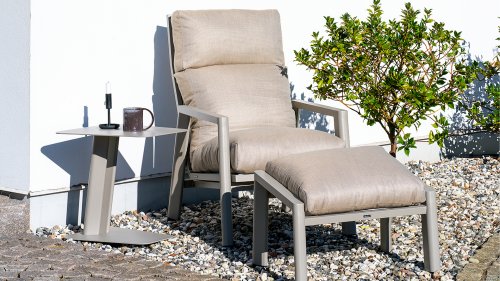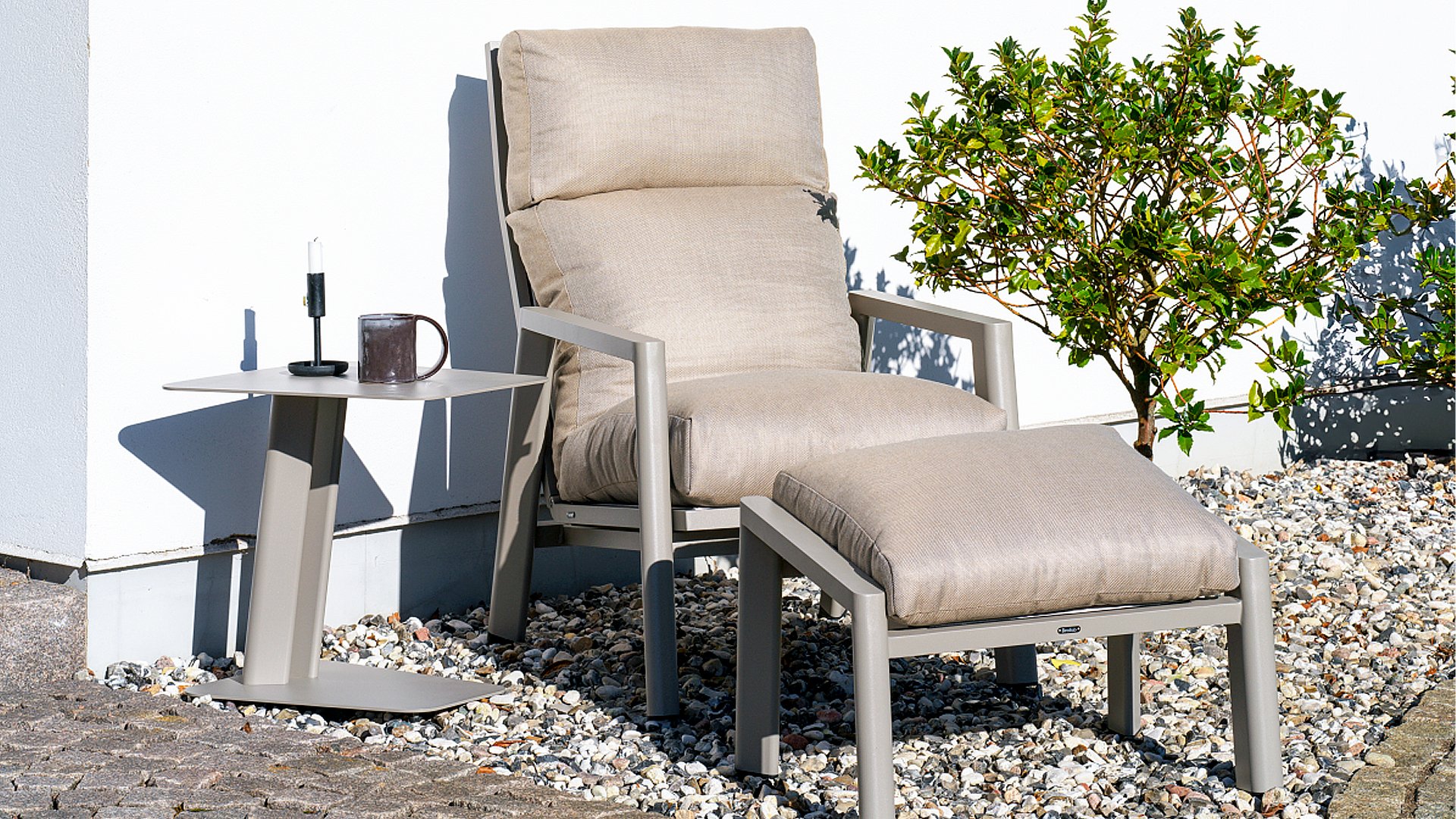 Brafab Slide Lounge: een comfortabel loungestoel met traploze verstelling van de rugleuning gemaakt van moderne materialen. De voetenbank is een waardevolle uitbreiding om het loungecomfort extra te verhogen.
