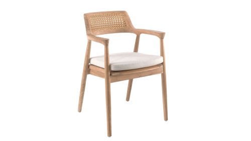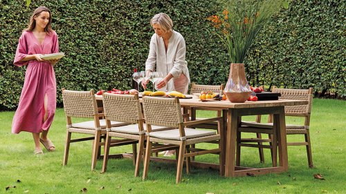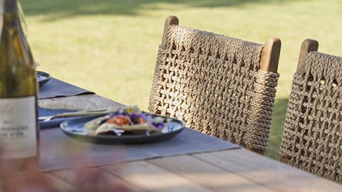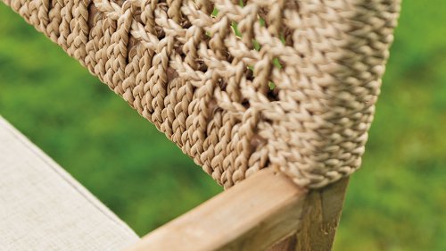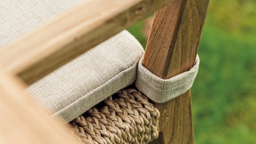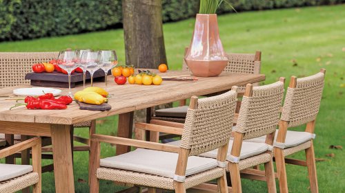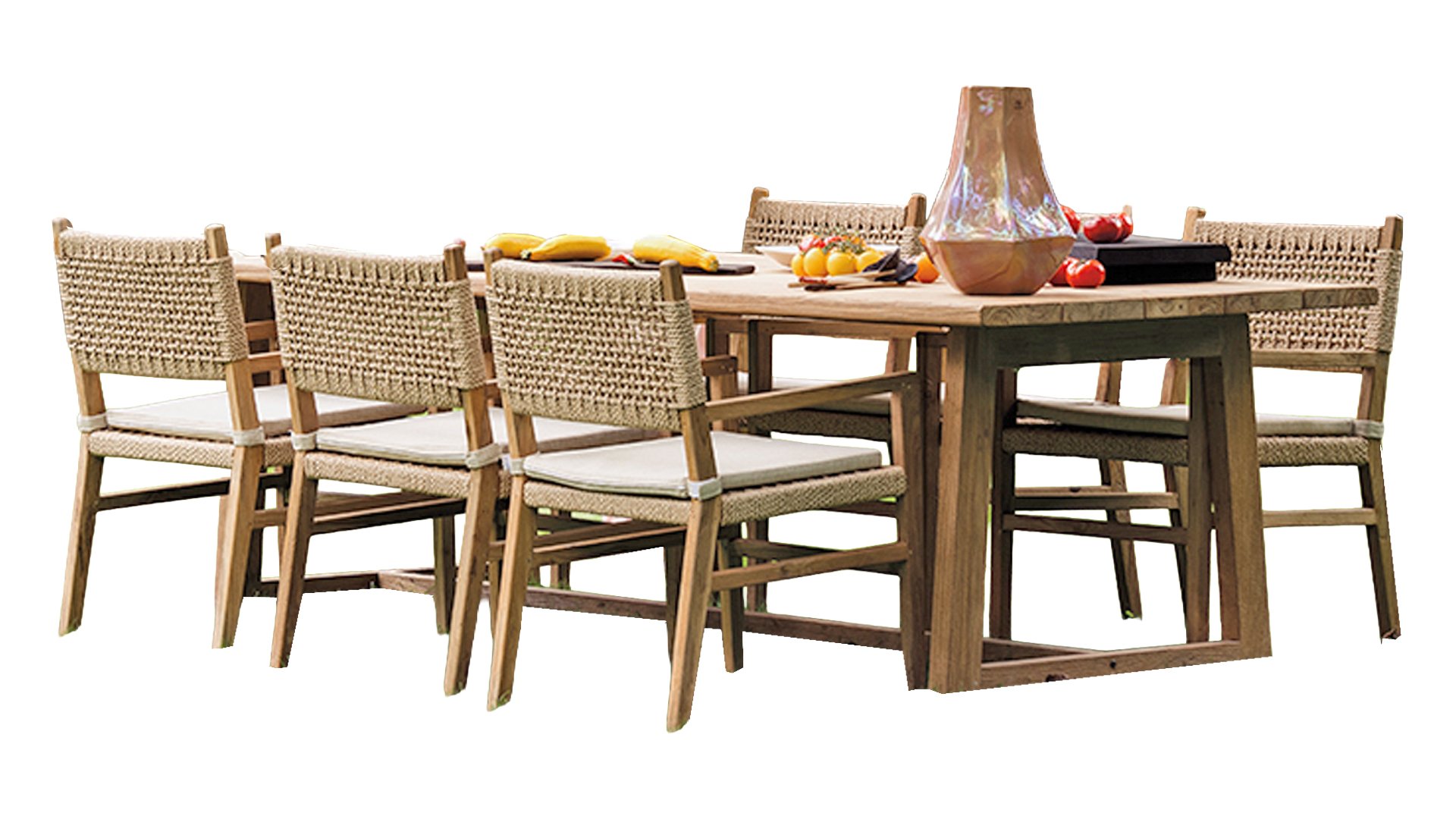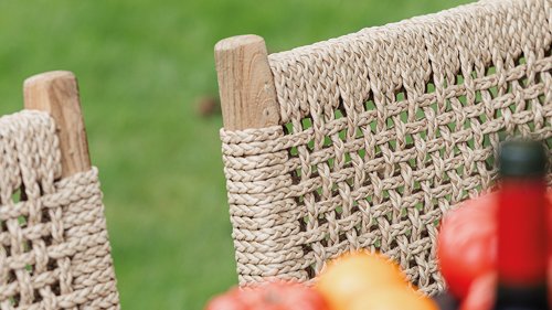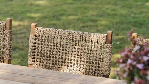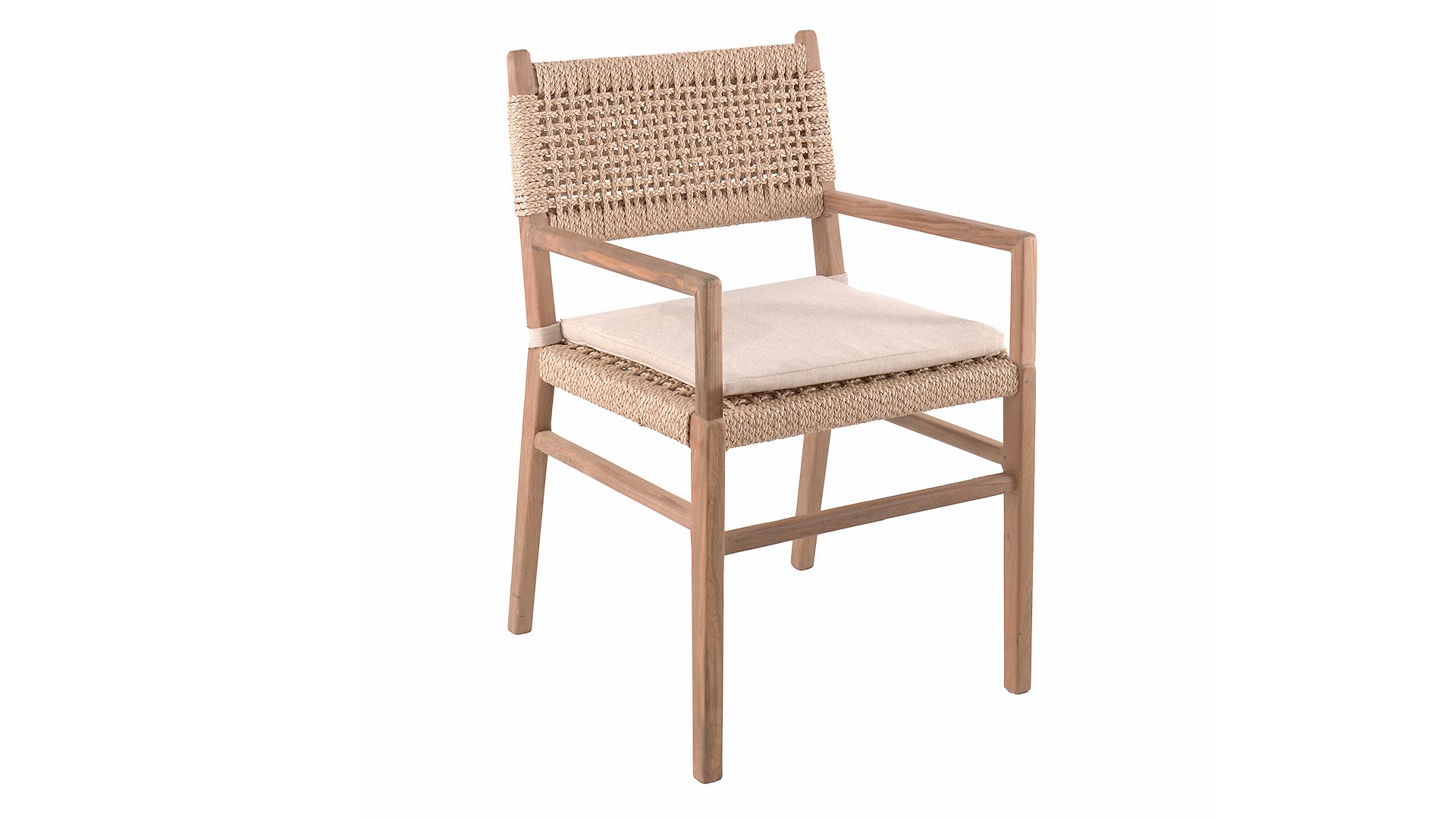 Wat de Menorca tuinstoel uniek maakt, is het gebruik van gerecycleerd teakhout. Elk stuk hout draagt zijn eigen geschiedenis, wat zorgt voor een levendige en authentieke uitstraling. In combinatie met het handgevlochten vlechtwerk ontstaat een natuurlijke harmonie die warmte en karakter uitstraalt.