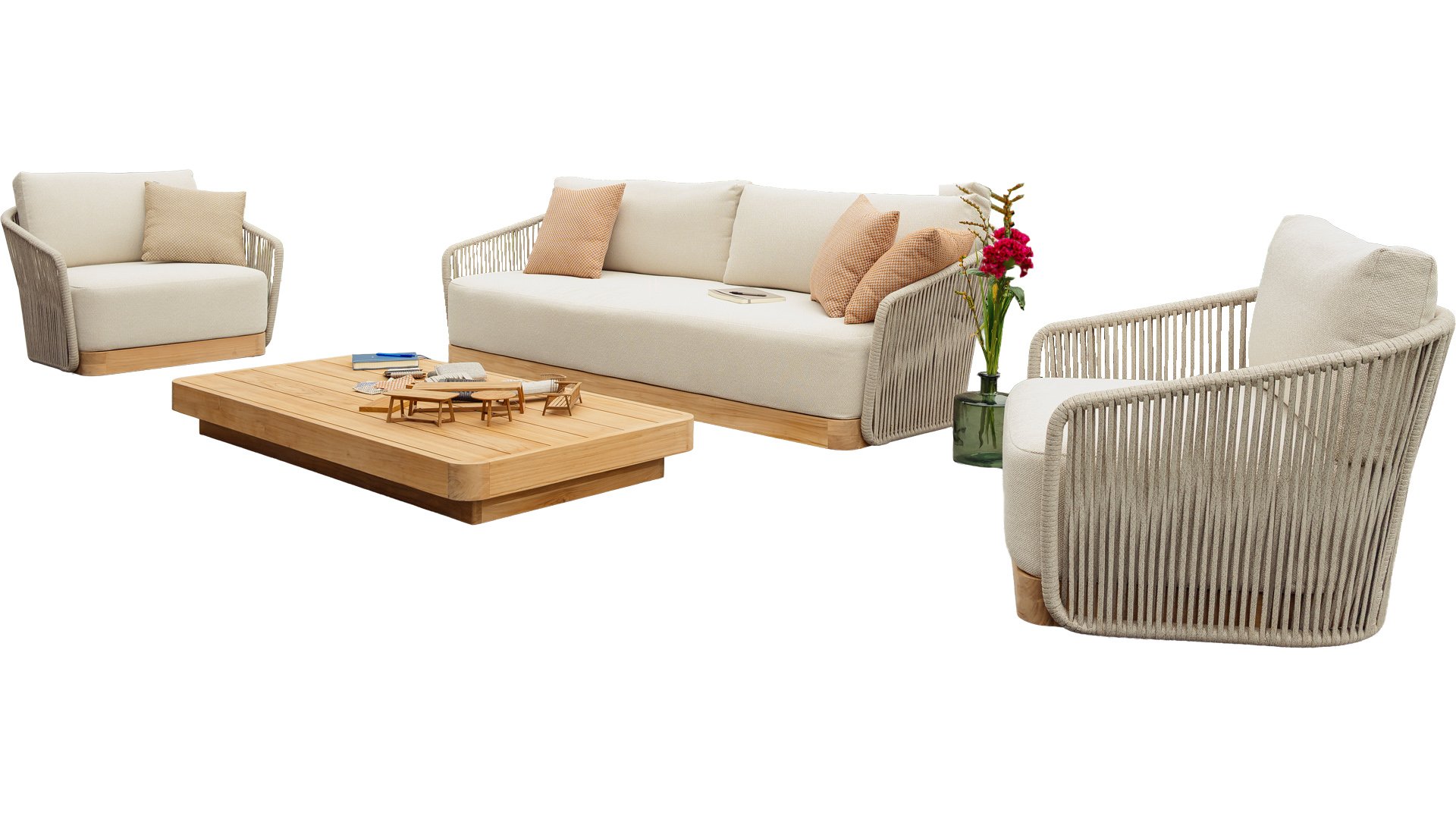 - Duurzame materialen zoals Rope, Teak, RVS, aluminium en Olefin kussens.