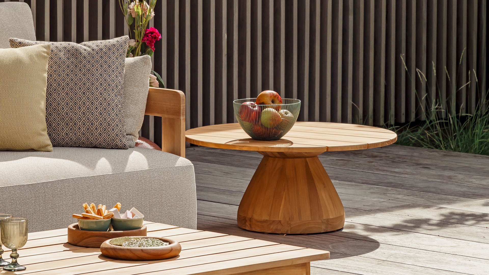 Het hoogwaardige teak geeft het loungeset een warme, natuurlijke look en staat bekend om zijn sterke, duurzame karakter. Dit is buitenkwaliteit die je ziet én voelt.
