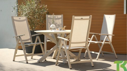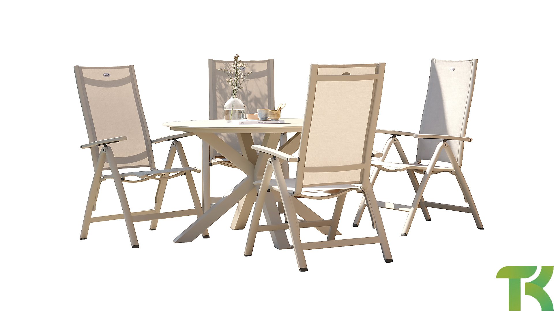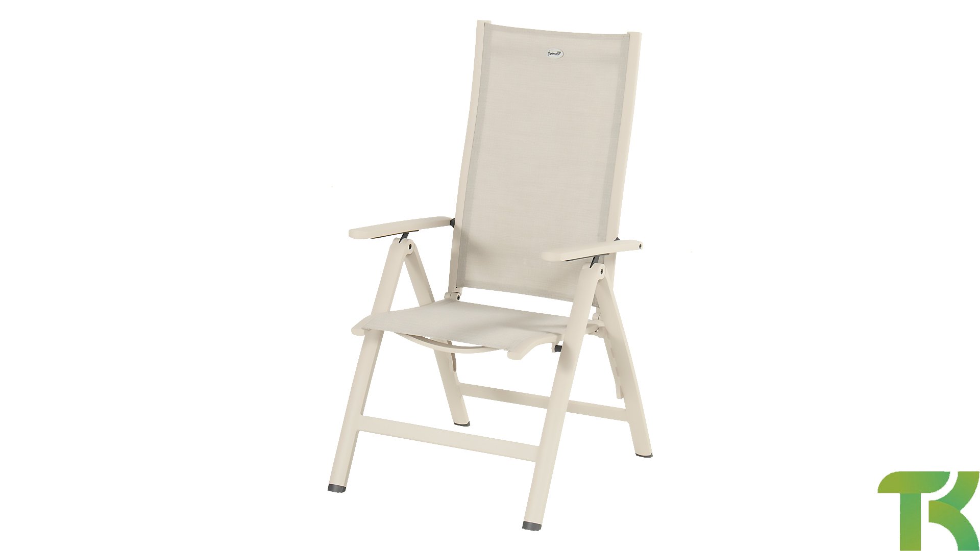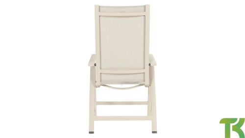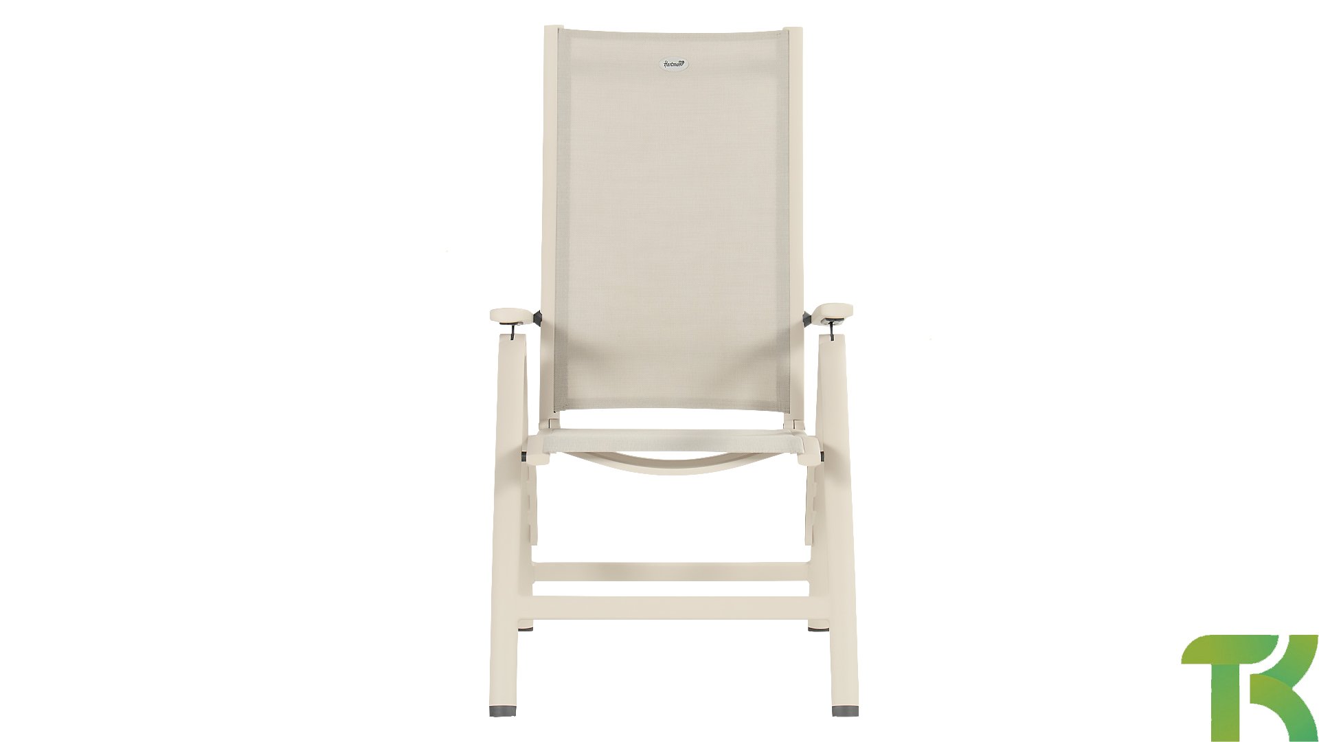 De Troy verstelbare stoel biedt ultiem comfort en een moderne uitstraling. Het zandkleurige aluminium frame is licht en robuust, terwijl het beige textileen zitvlak comfortabel zit en duurzaam is. Perfect voor lange zomerdagen of ontspannende momenten op het terras.