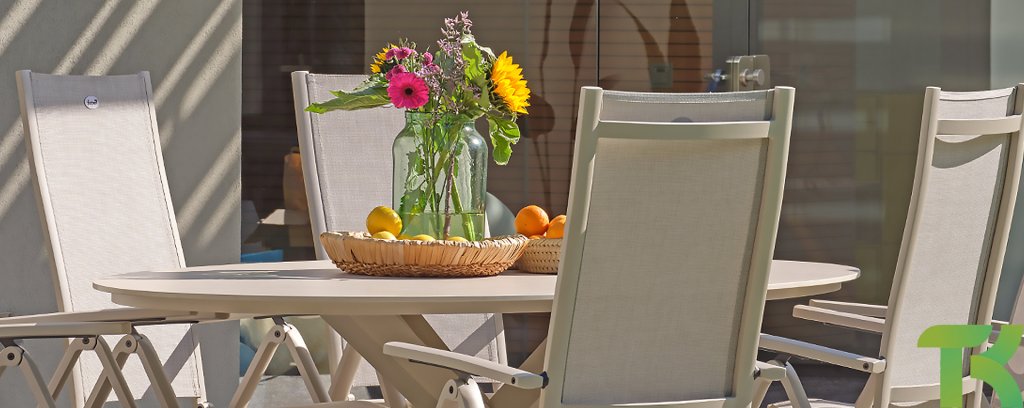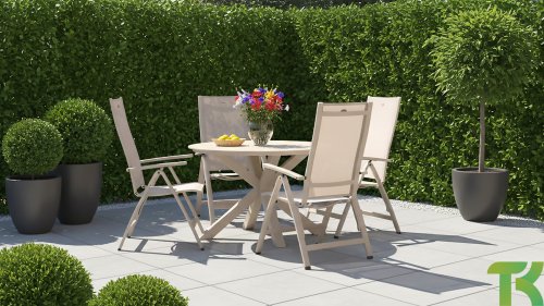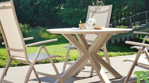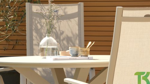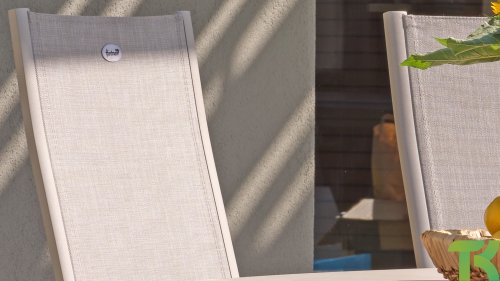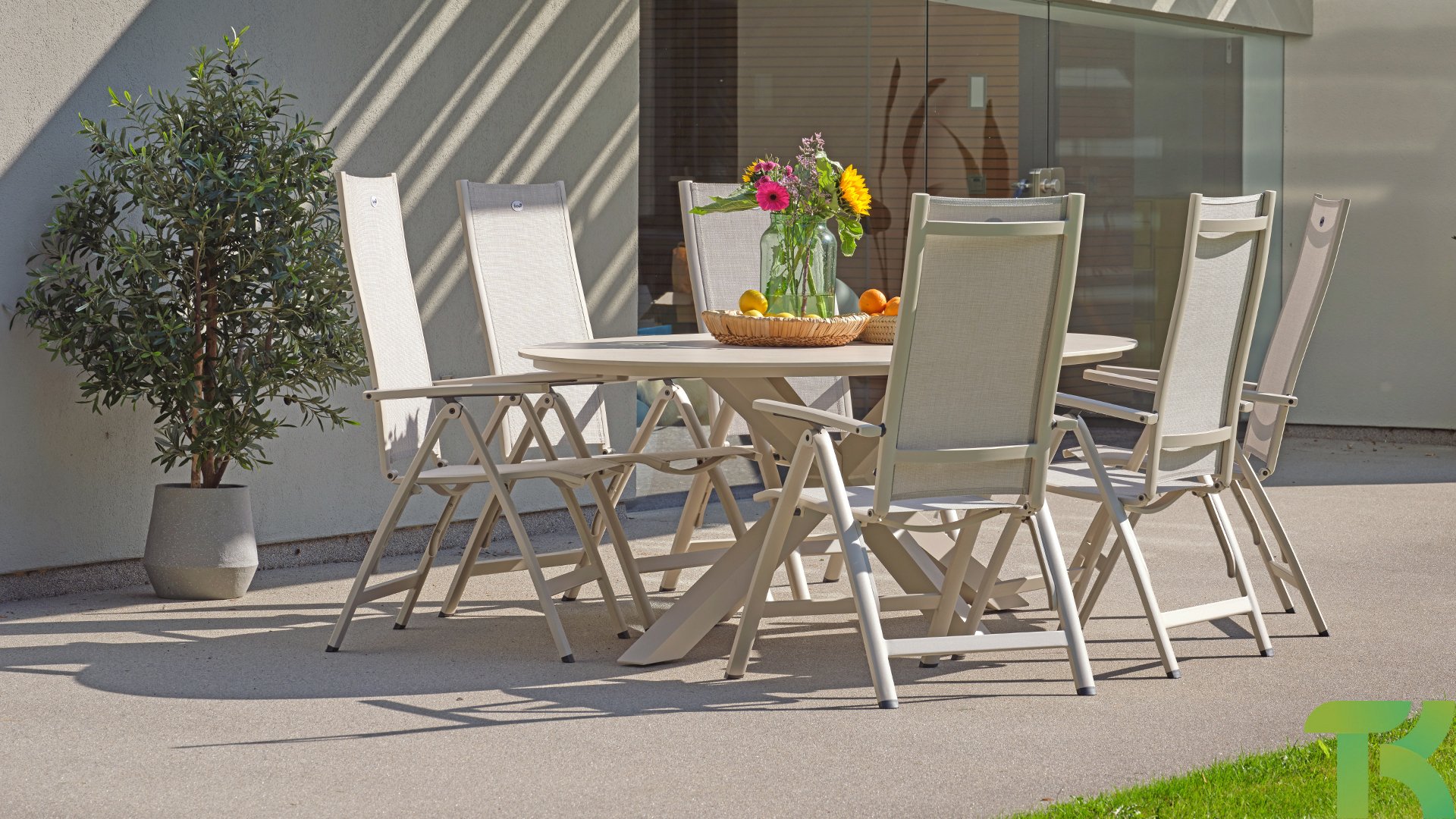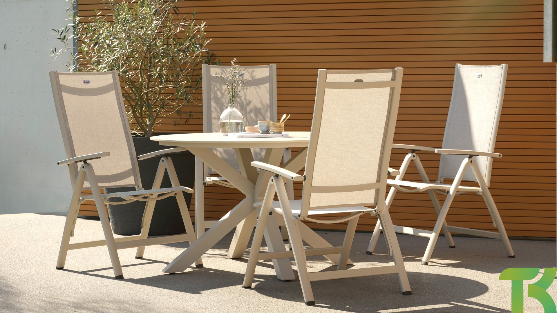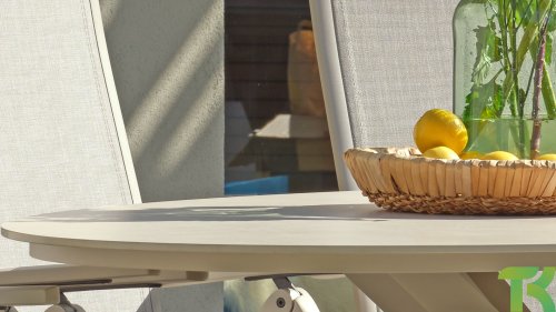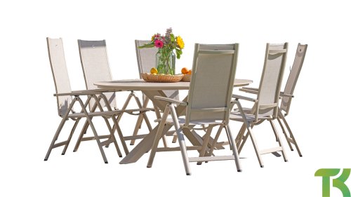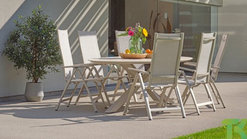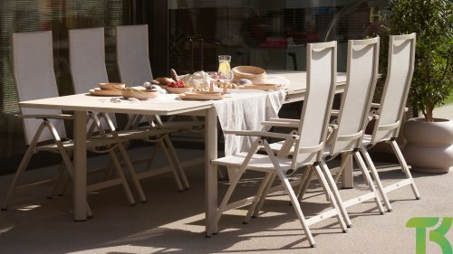 De Troy verstelbare stoel biedt ultiem comfort en een moderne uitstraling. Het zandkleurige aluminium frame is licht en robuust, terwijl het beige textileen zitvlak comfortabel zit en duurzaam is. Perfect voor lange zomerdagen of ontspannende momenten op het terras.